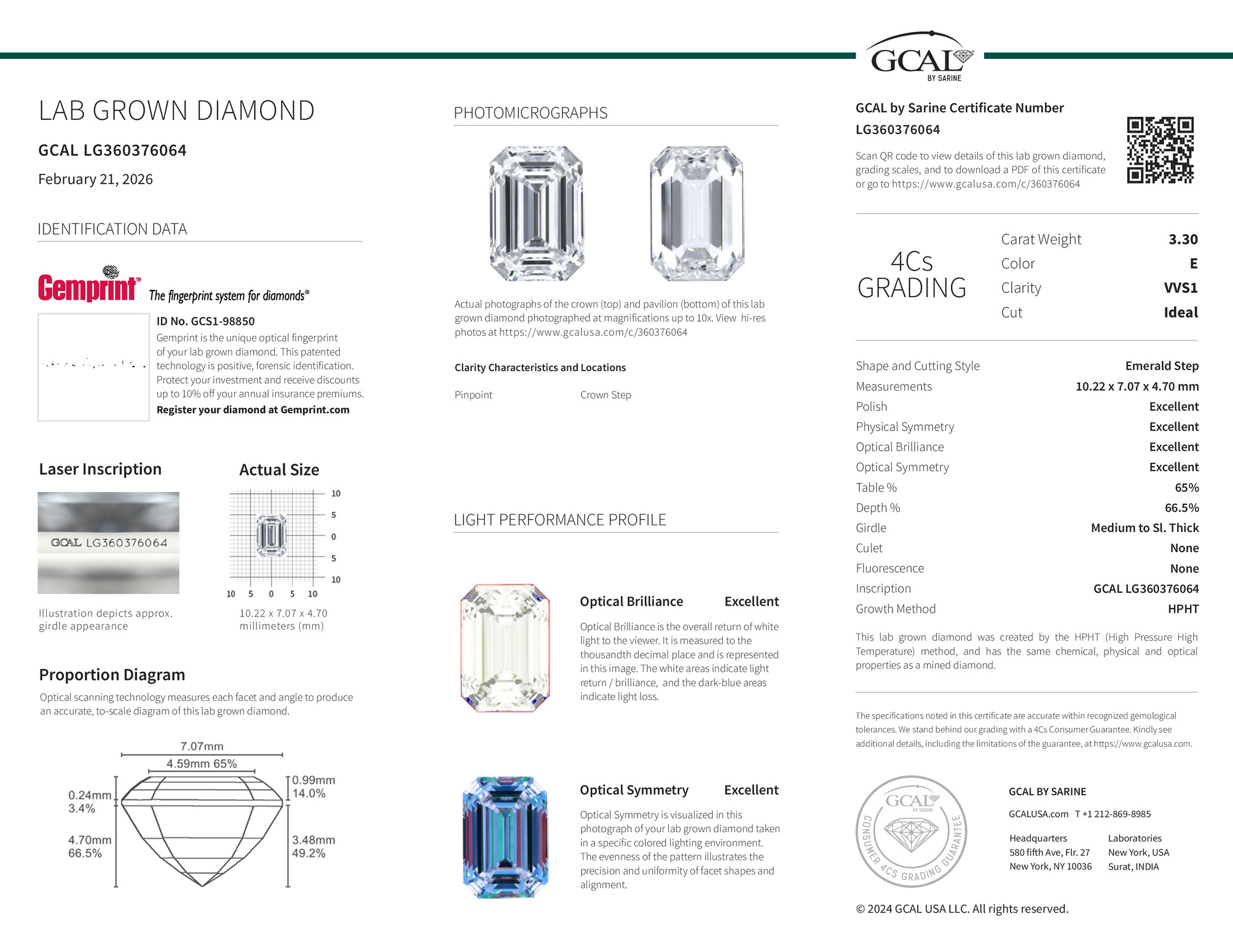 The GCAL certificate (#360376064) is an independent grading report that verifies this diamond's carat weight, color, clarity, cut, and other physical properties. It serves as a trusted third-party guarantee of the stone's quality. Always verify the certificate number on the issuing lab's website before purchasing.