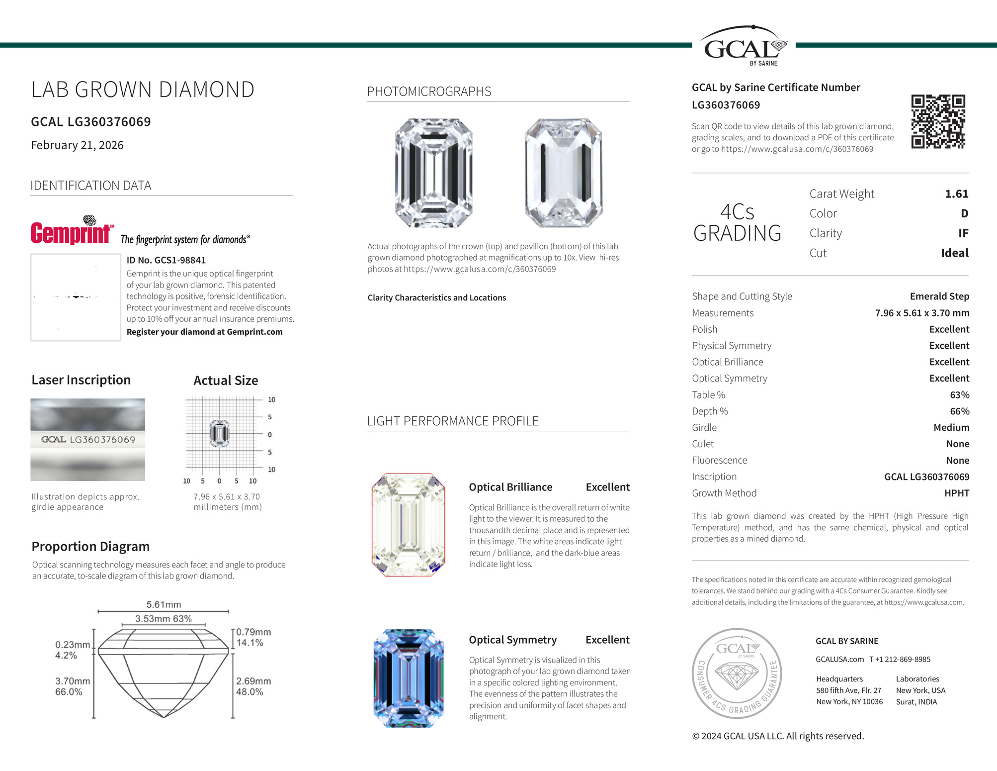 The GCAL certificate (#360376069) is an independent grading report that verifies this diamond's carat weight, color, clarity, cut, and other physical properties. It serves as a trusted third-party guarantee of the stone's quality. Always verify the certificate number on the issuing lab's website before purchasing.