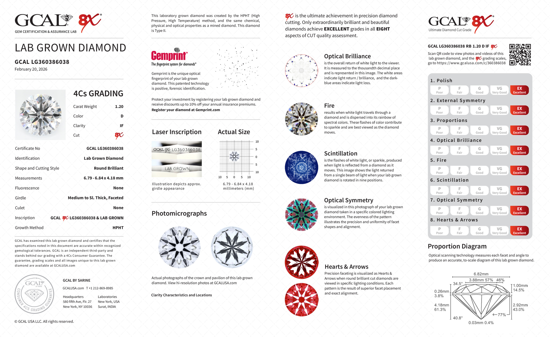 The GCAL certificate (#360386038) is an independent grading report that verifies this diamond's carat weight, color, clarity, cut, and other physical properties. It serves as a trusted third-party guarantee of the stone's quality. Always verify the certificate number on the issuing lab's website before purchasing.