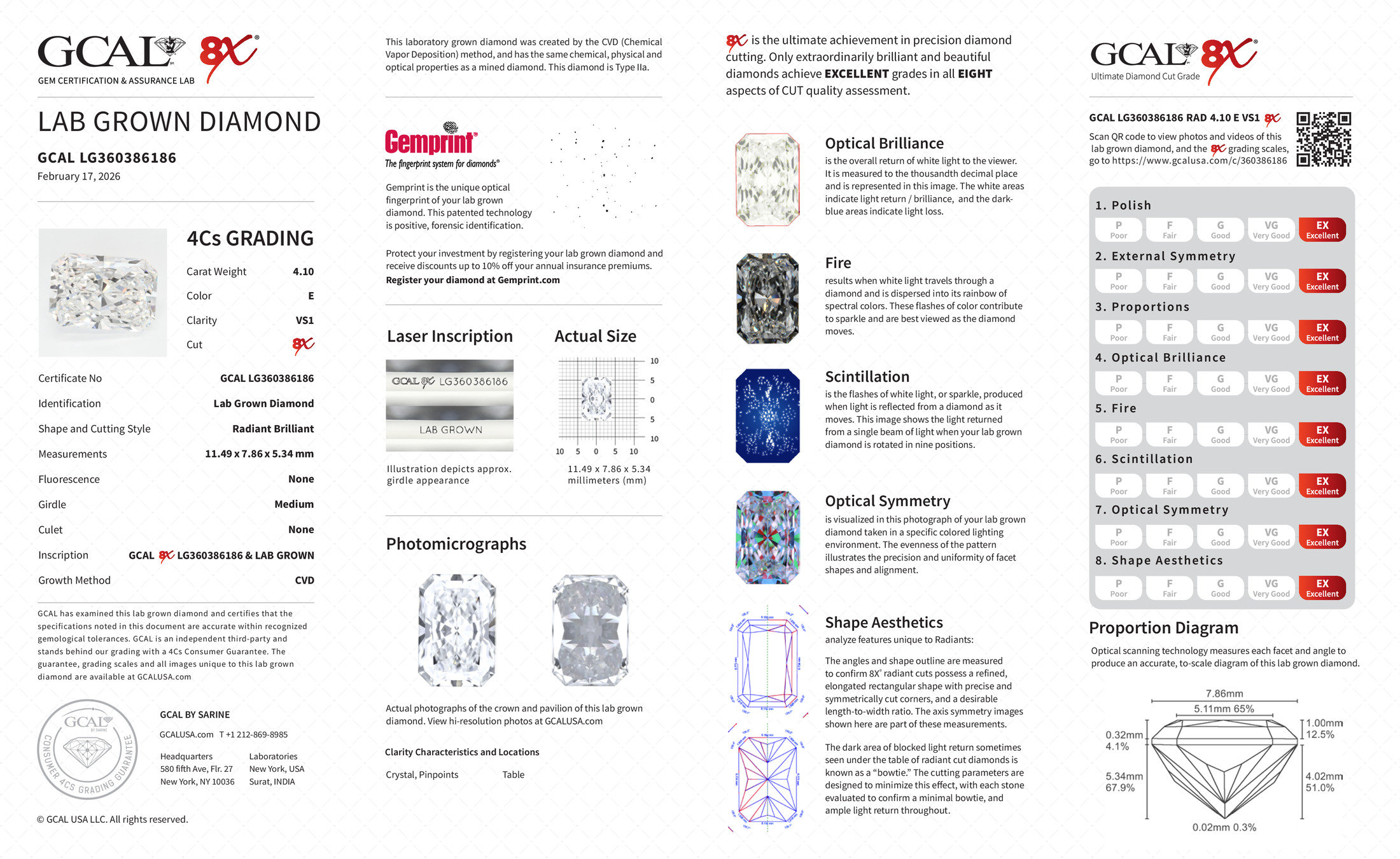 The GCAL certificate (#360386186) is an independent grading report that verifies this diamond's carat weight, color, clarity, cut, and other physical properties. It serves as a trusted third-party guarantee of the stone's quality. Always verify the certificate number on the issuing lab's website before purchasing.