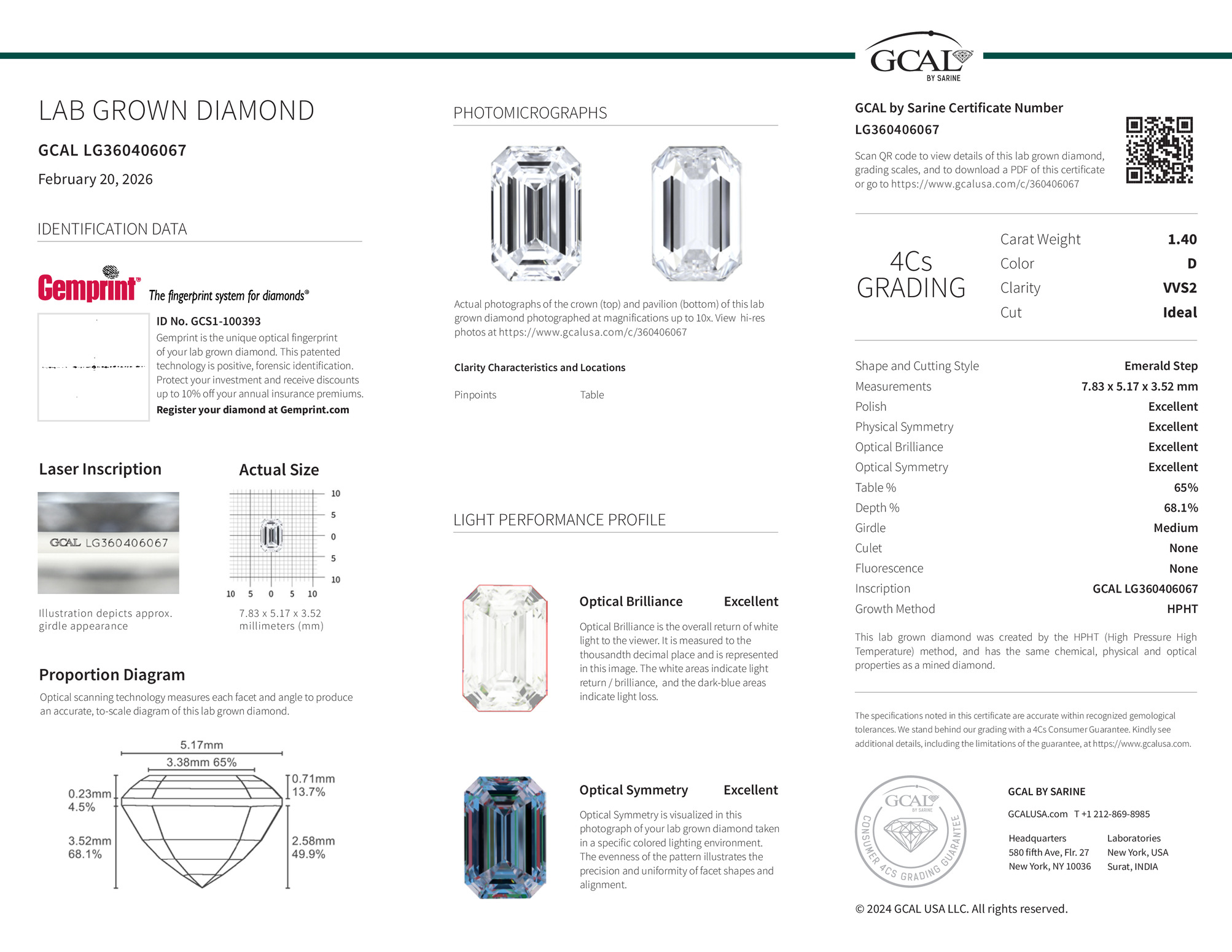 The GCAL certificate (#360406067) is an independent grading report that verifies this diamond's carat weight, color, clarity, cut, and other physical properties. It serves as a trusted third-party guarantee of the stone's quality. Always verify the certificate number on the issuing lab's website before purchasing.