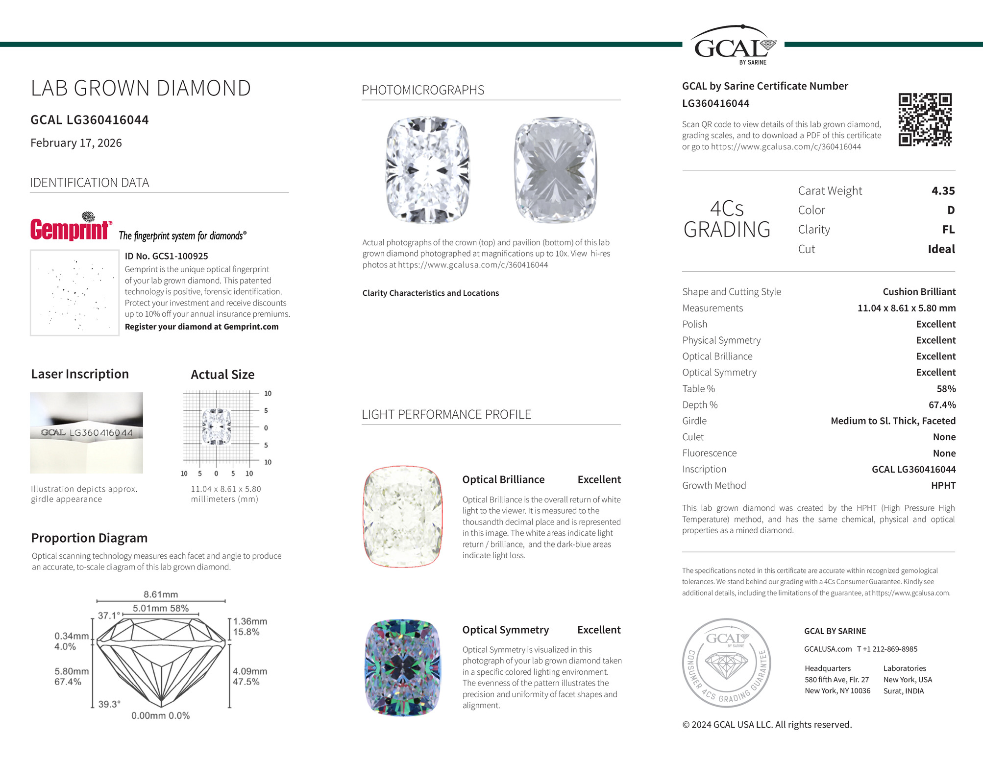 The GCAL certificate (#360416044) is an independent grading report that verifies this diamond's carat weight, color, clarity, cut, and other physical properties. It serves as a trusted third-party guarantee of the stone's quality. Always verify the certificate number on the issuing lab's website before purchasing.