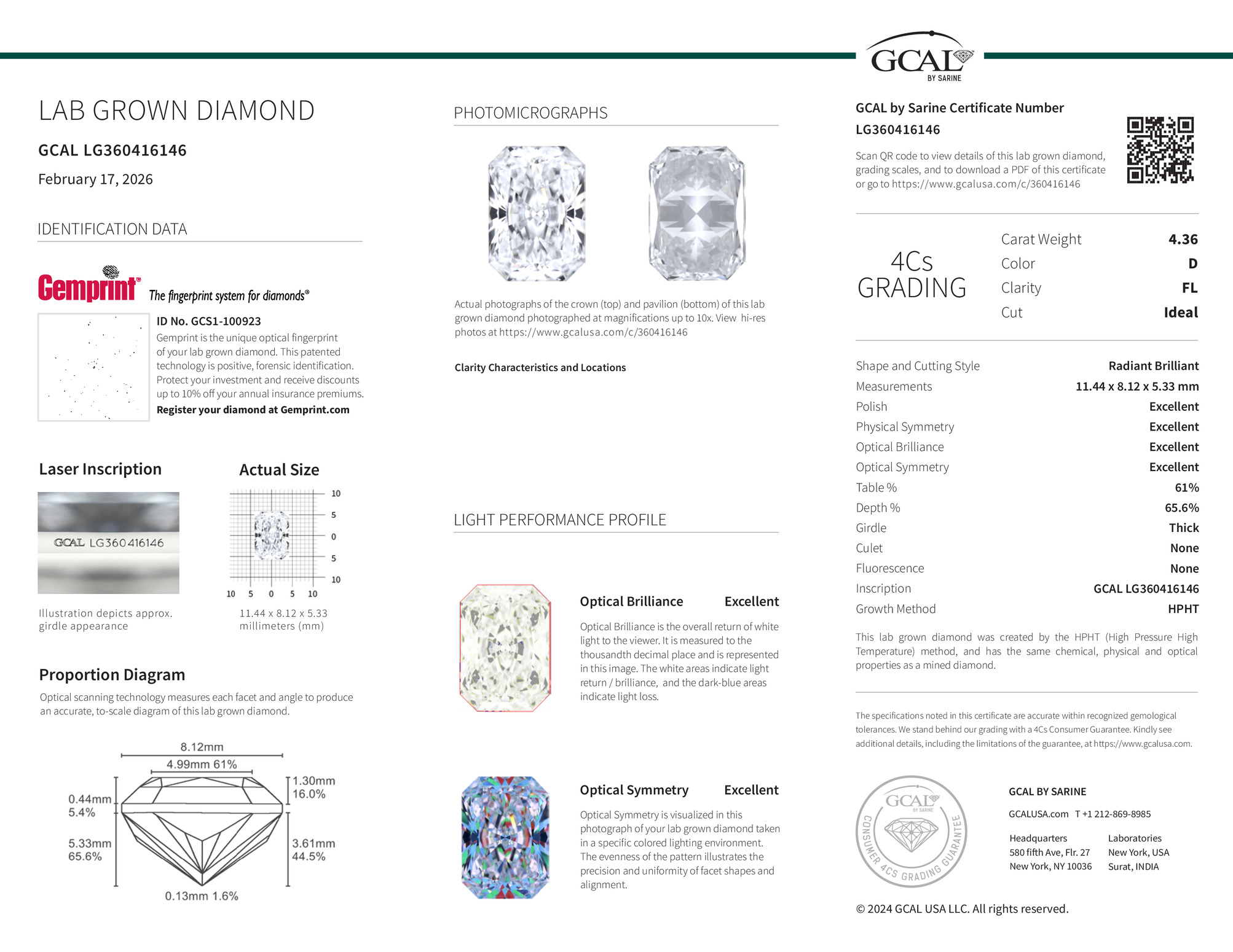 The GCAL certificate (#360416146) is an independent grading report that verifies this diamond's carat weight, color, clarity, cut, and other physical properties. It serves as a trusted third-party guarantee of the stone's quality. Always verify the certificate number on the issuing lab's website before purchasing.