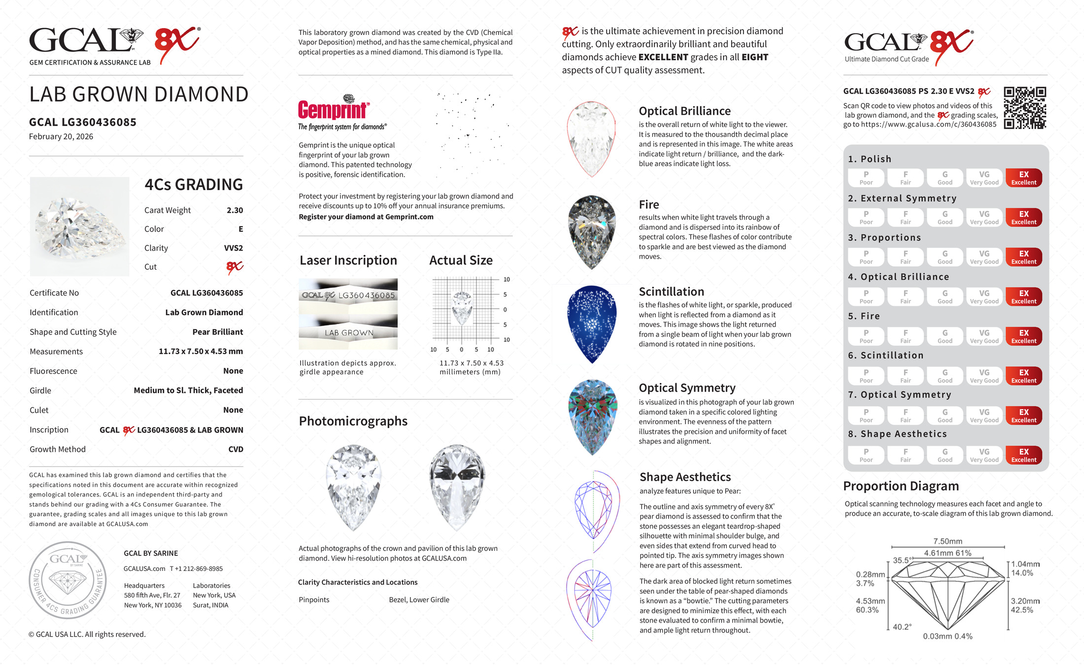 The GCAL certificate (#360436085) is an independent grading report that verifies this diamond's carat weight, color, clarity, cut, and other physical properties. It serves as a trusted third-party guarantee of the stone's quality. Always verify the certificate number on the issuing lab's website before purchasing.