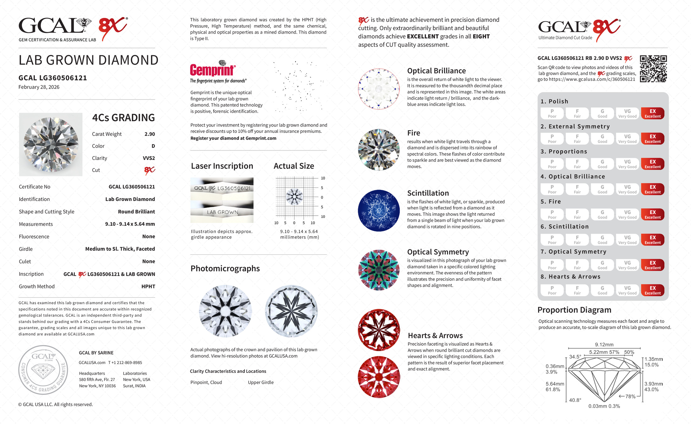 The GCAL certificate (#360506121) is an independent grading report that verifies this diamond's carat weight, color, clarity, cut, and other physical properties. It serves as a trusted third-party guarantee of the stone's quality. Always verify the certificate number on the issuing lab's website before purchasing.