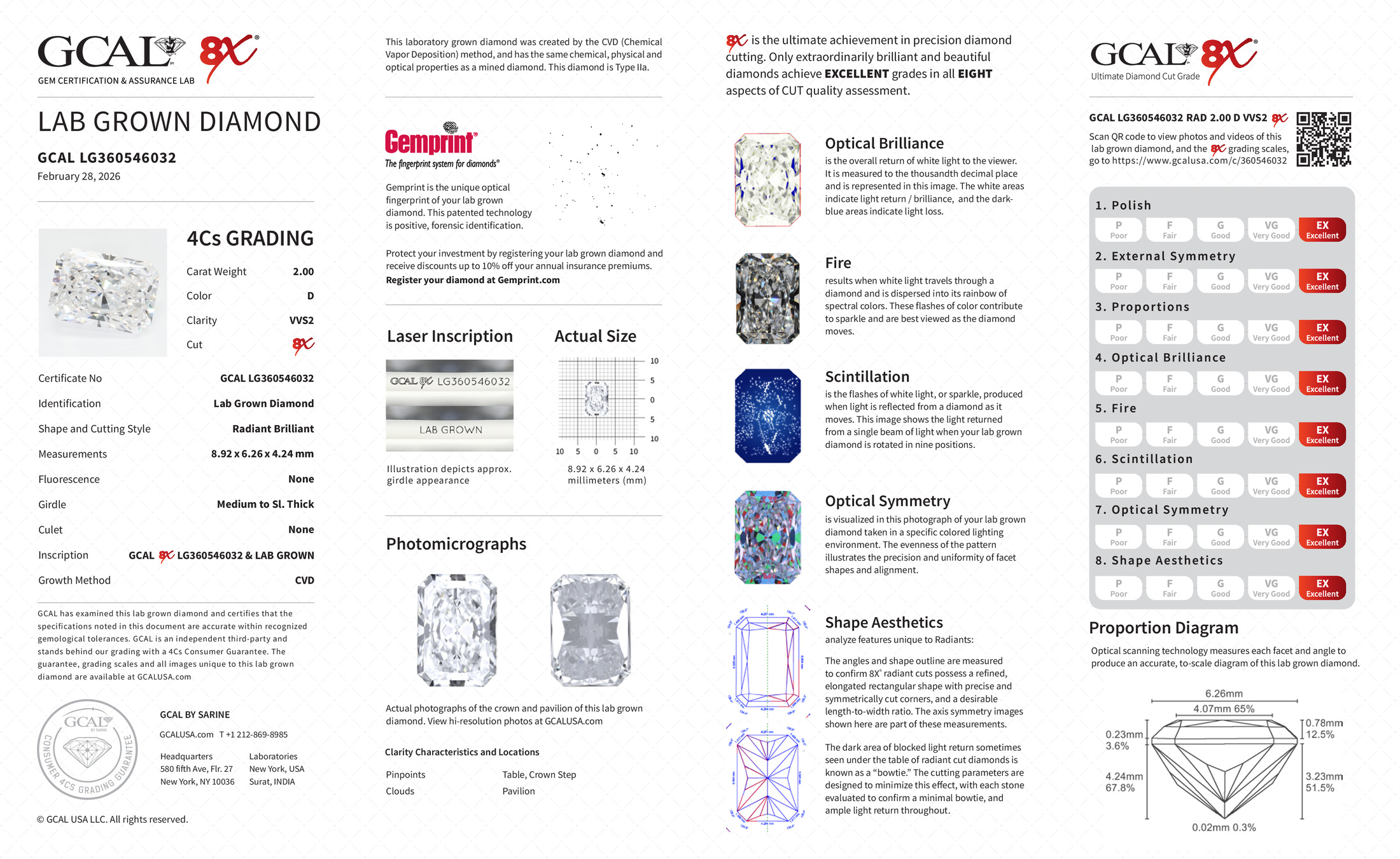 The GCAL certificate (#360546032) is an independent grading report that verifies this diamond's carat weight, color, clarity, cut, and other physical properties. It serves as a trusted third-party guarantee of the stone's quality. Always verify the certificate number on the issuing lab's website before purchasing.