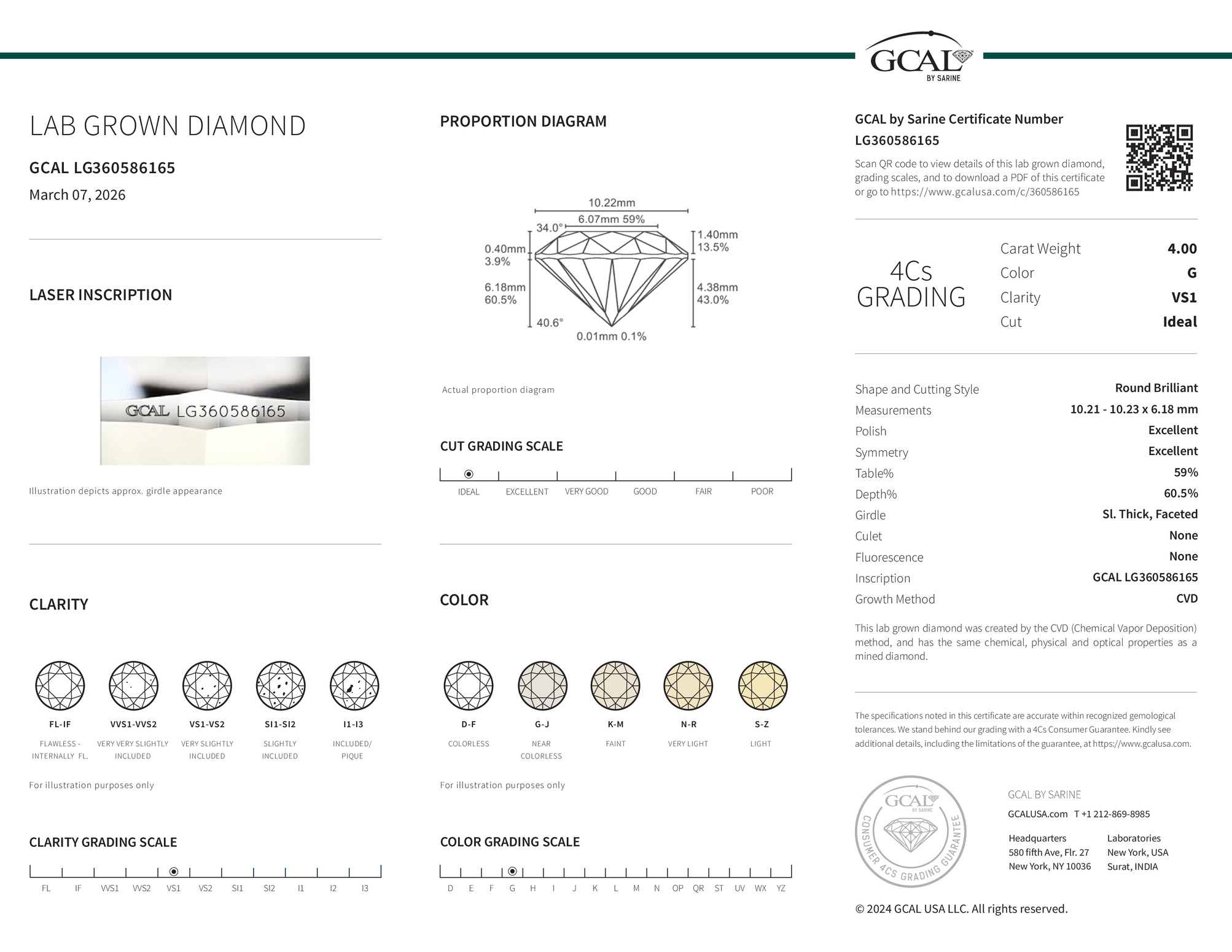 The GCAL certificate (#360586165) is an independent grading report that verifies this diamond's carat weight, color, clarity, cut, and other physical properties. It serves as a trusted third-party guarantee of the stone's quality. Always verify the certificate number on the issuing lab's website before purchasing.