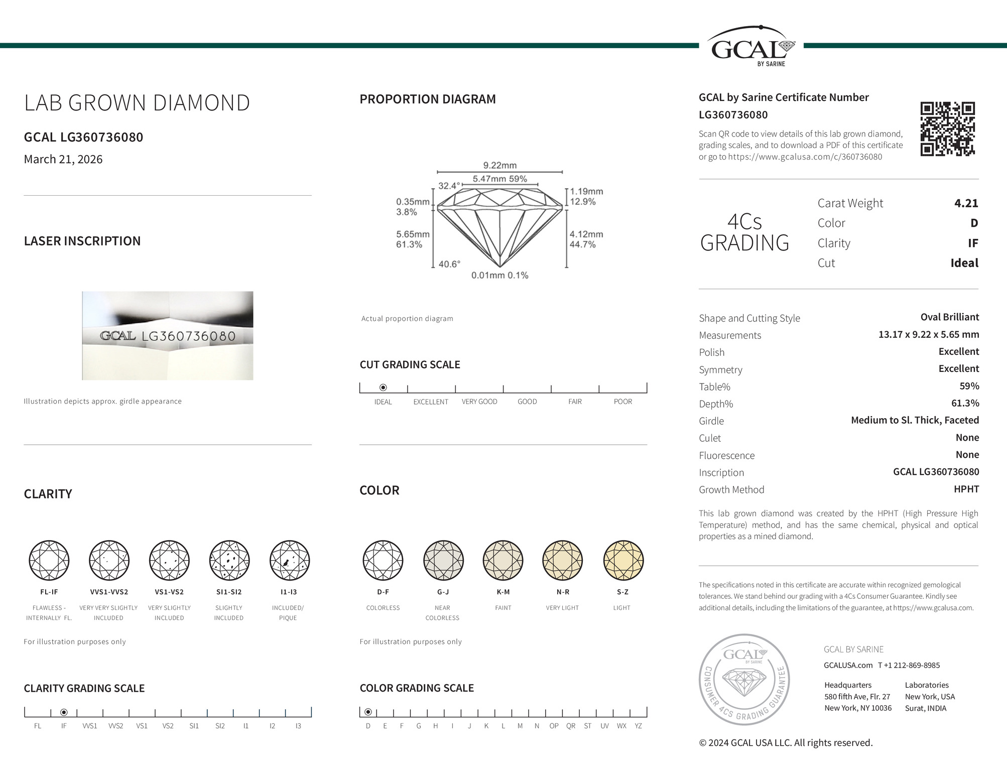 The GCAL certificate (#360736080) is an independent grading report that verifies this diamond's carat weight, color, clarity, cut, and other physical properties. It serves as a trusted third-party guarantee of the stone's quality. Always verify the certificate number on the issuing lab's website before purchasing.