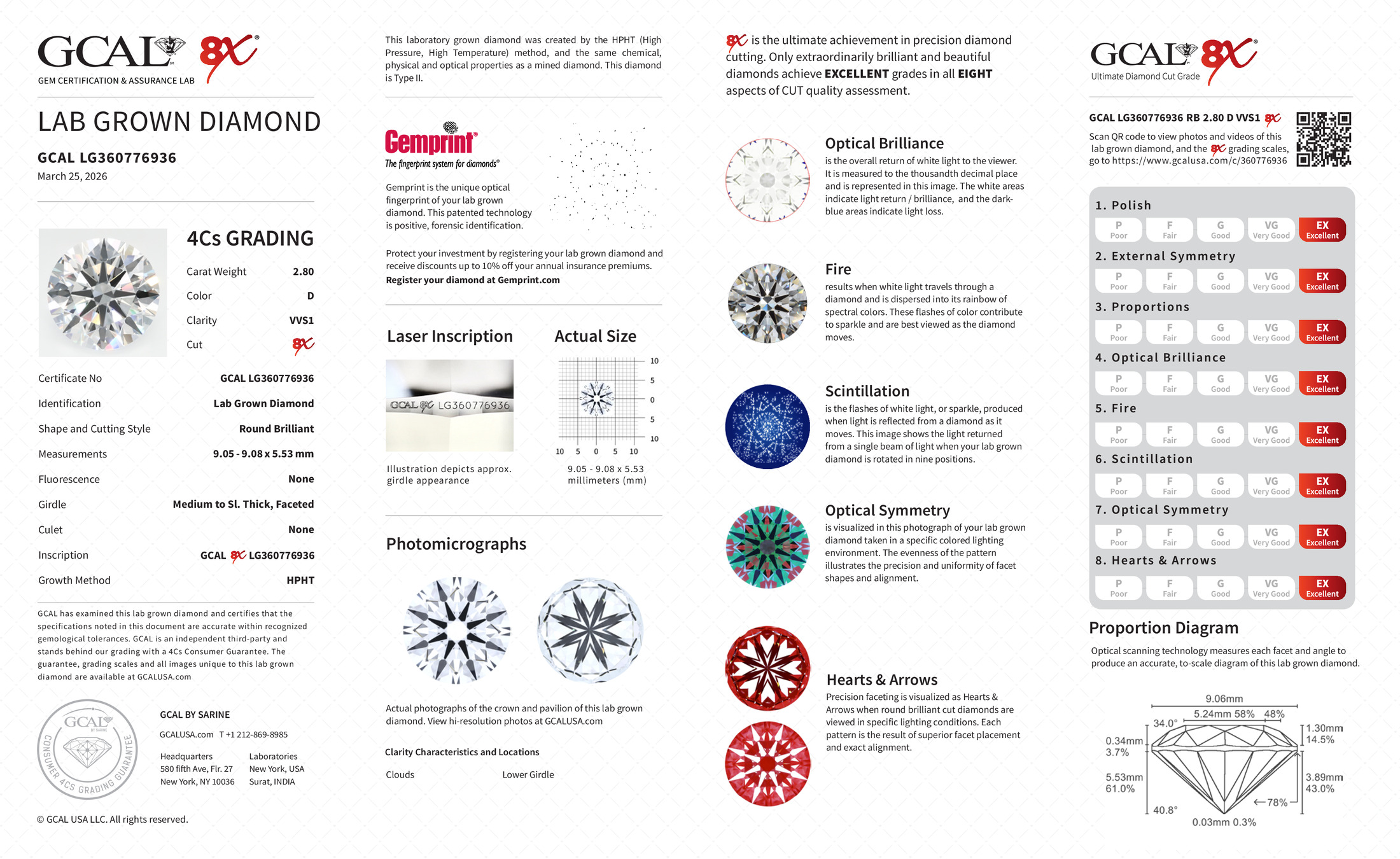 The GCAL certificate (#360776936) is an independent grading report that verifies this diamond's carat weight, color, clarity, cut, and other physical properties. It serves as a trusted third-party guarantee of the stone's quality. Always verify the certificate number on the issuing lab's website before purchasing.