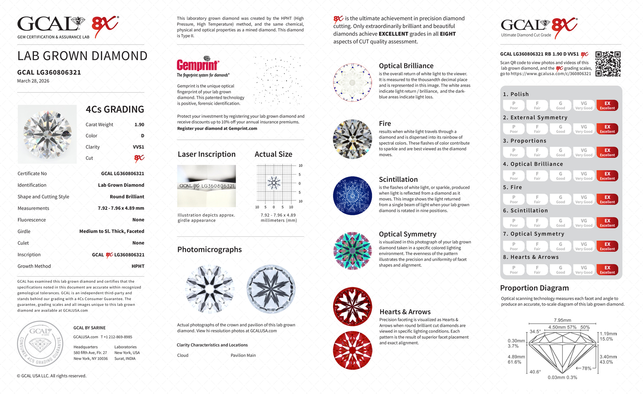 The GCAL certificate (#360806321) is an independent grading report that verifies this diamond's carat weight, color, clarity, cut, and other physical properties. It serves as a trusted third-party guarantee of the stone's quality. Always verify the certificate number on the issuing lab's website before purchasing.
