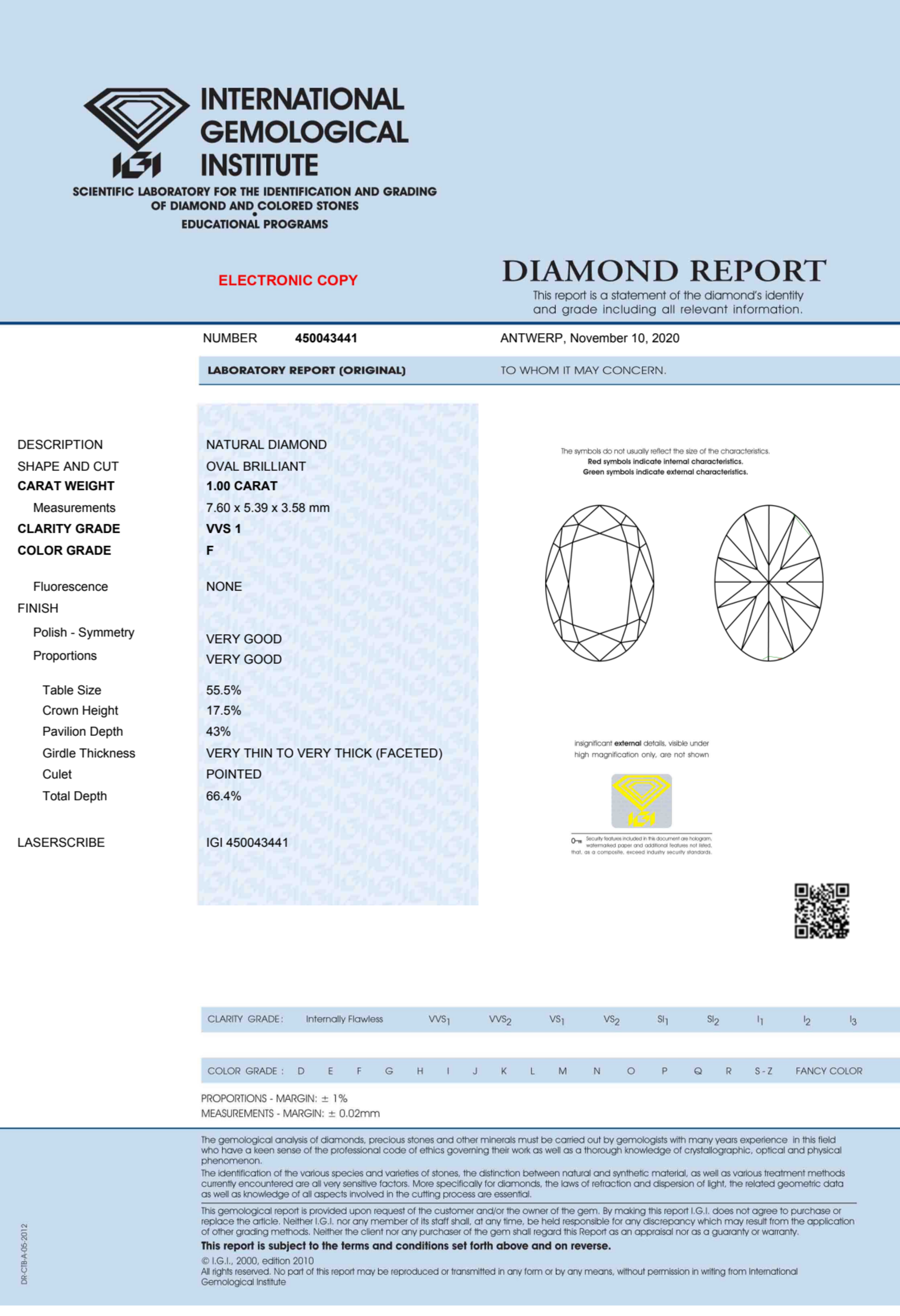 The IGI certificate (#450043441) is an independent grading report that verifies this diamond's carat weight, color, clarity, cut, and other physical properties. It serves as a trusted third-party guarantee of the stone's quality. Always verify the certificate number on the issuing lab's website before purchasing.