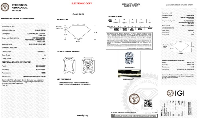 This 1.5 carat radiant cut lab grown diamond (IGI #485158106) is currently listed at 5 retailers. Prices across stores range from $877 to $2,290, a spread of $1,413 (161%). The same certified stone can vary in price depending on a retailer's margin, promotions, and included services comparing offers side by side is the fastest way to find the best deal.