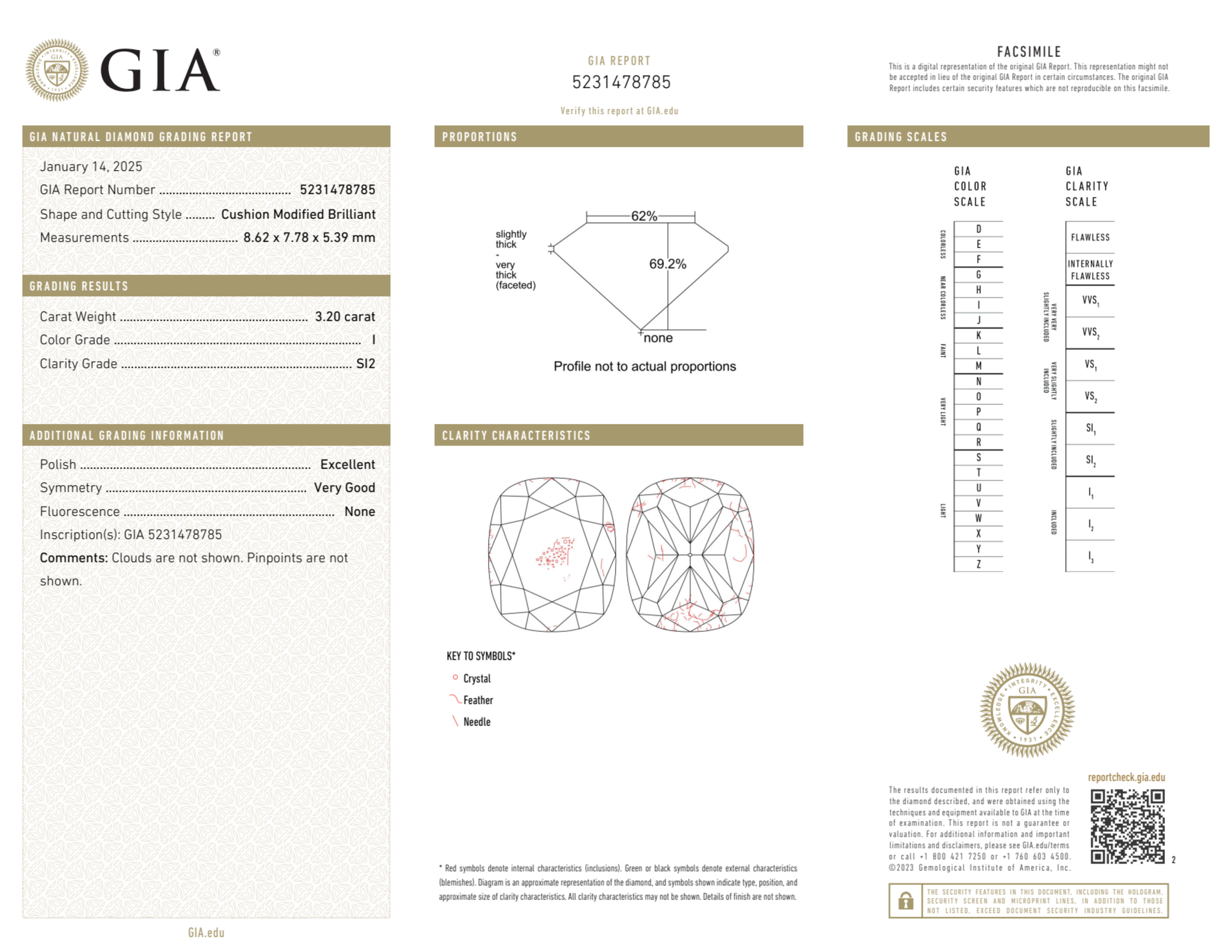The GIA certificate (#5231478785) is an independent grading report that verifies this diamond's carat weight, color, clarity, cut, and other physical properties. It serves as a trusted third-party guarantee of the stone's quality. Always verify the certificate number on the issuing lab's website before purchasing.