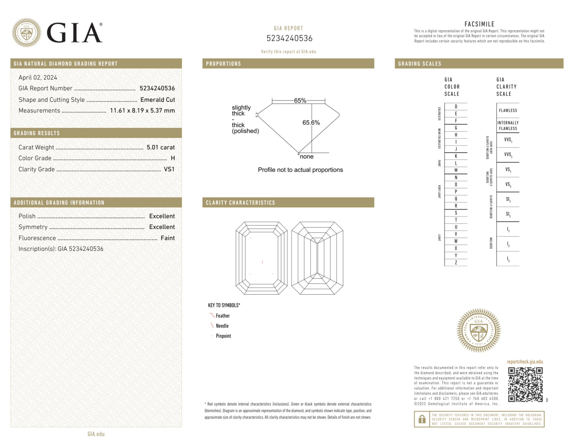 The GIA certificate (#5234240536) is an independent grading report that verifies this diamond's carat weight, color, clarity, cut, and other physical properties. It serves as a trusted third-party guarantee of the stone's quality. Always verify the certificate number on the issuing lab's website before purchasing.