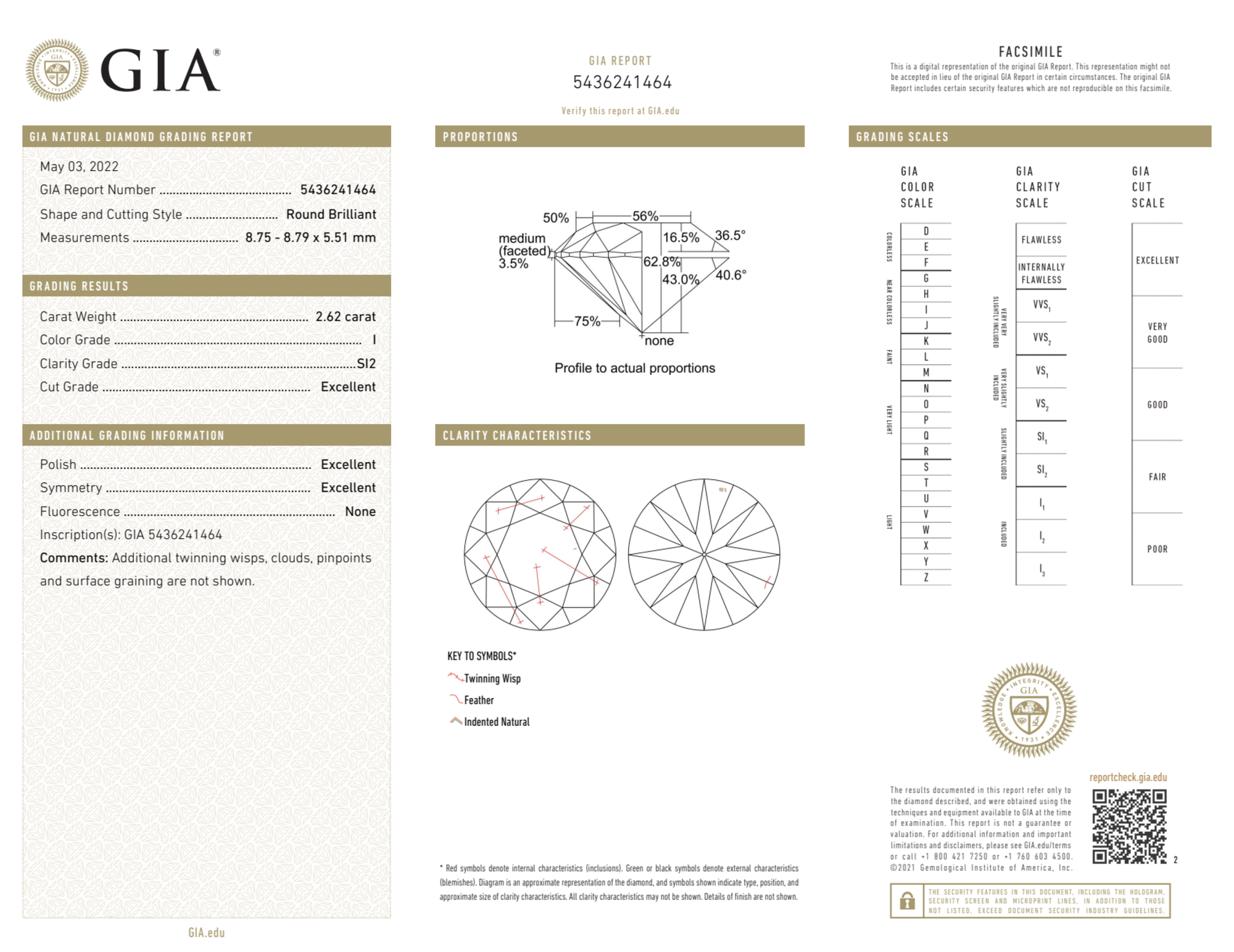 The GIA certificate (#5436241464) is an independent grading report that verifies this diamond's carat weight, color, clarity, cut, and other physical properties. It serves as a trusted third-party guarantee of the stone's quality. Always verify the certificate number on the issuing lab's website before purchasing.