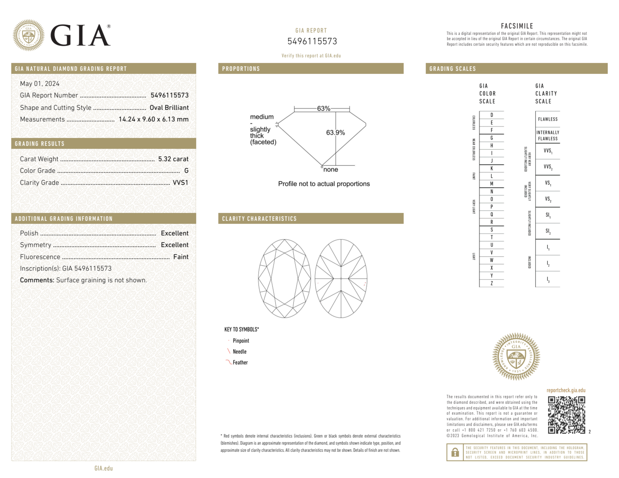 The GIA certificate (#5496115573) is an independent grading report that verifies this diamond's carat weight, color, clarity, cut, and other physical properties. It serves as a trusted third-party guarantee of the stone's quality. Always verify the certificate number on the issuing lab's website before purchasing.