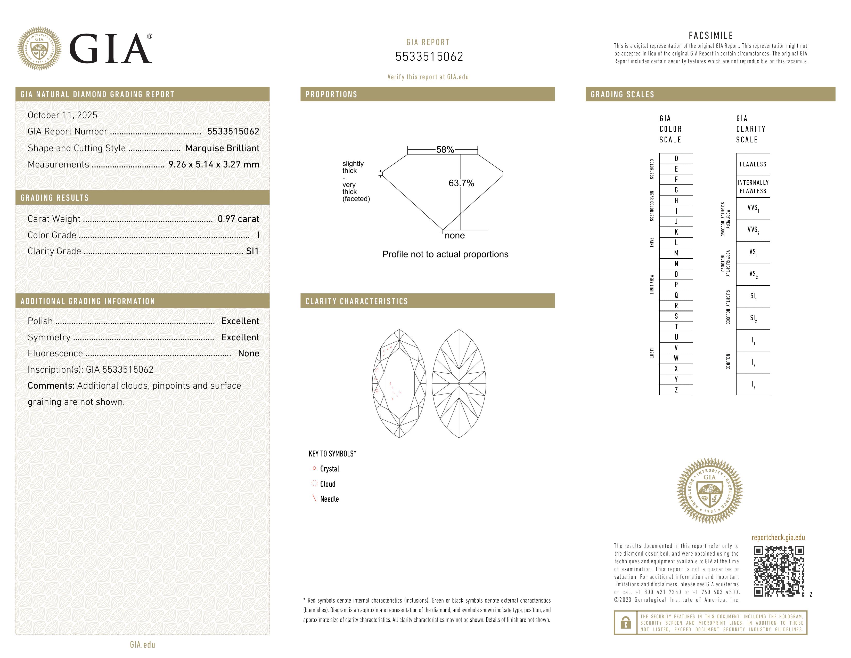 The GIA certificate (#5533515062) is an independent grading report that verifies this diamond's carat weight, color, clarity, cut, and other physical properties. It serves as a trusted third-party guarantee of the stone's quality. Always verify the certificate number on the issuing lab's website before purchasing.