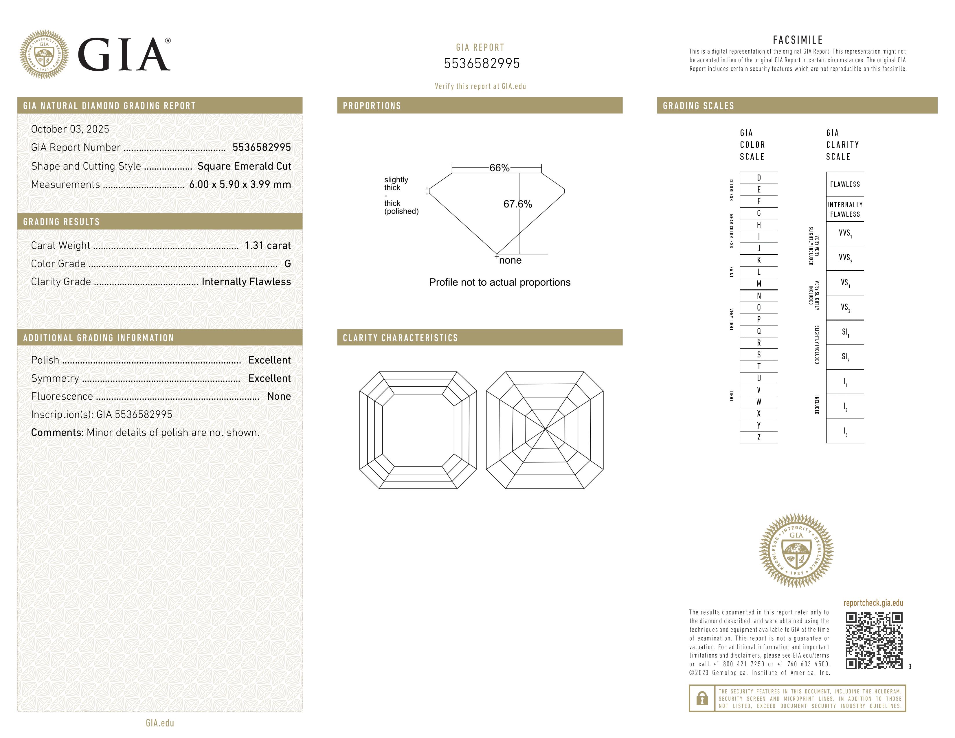 The GIA certificate (#5536582995) is an independent grading report that verifies this diamond's carat weight, color, clarity, cut, and other physical properties. It serves as a trusted third-party guarantee of the stone's quality. Always verify the certificate number on the issuing lab's website before purchasing.