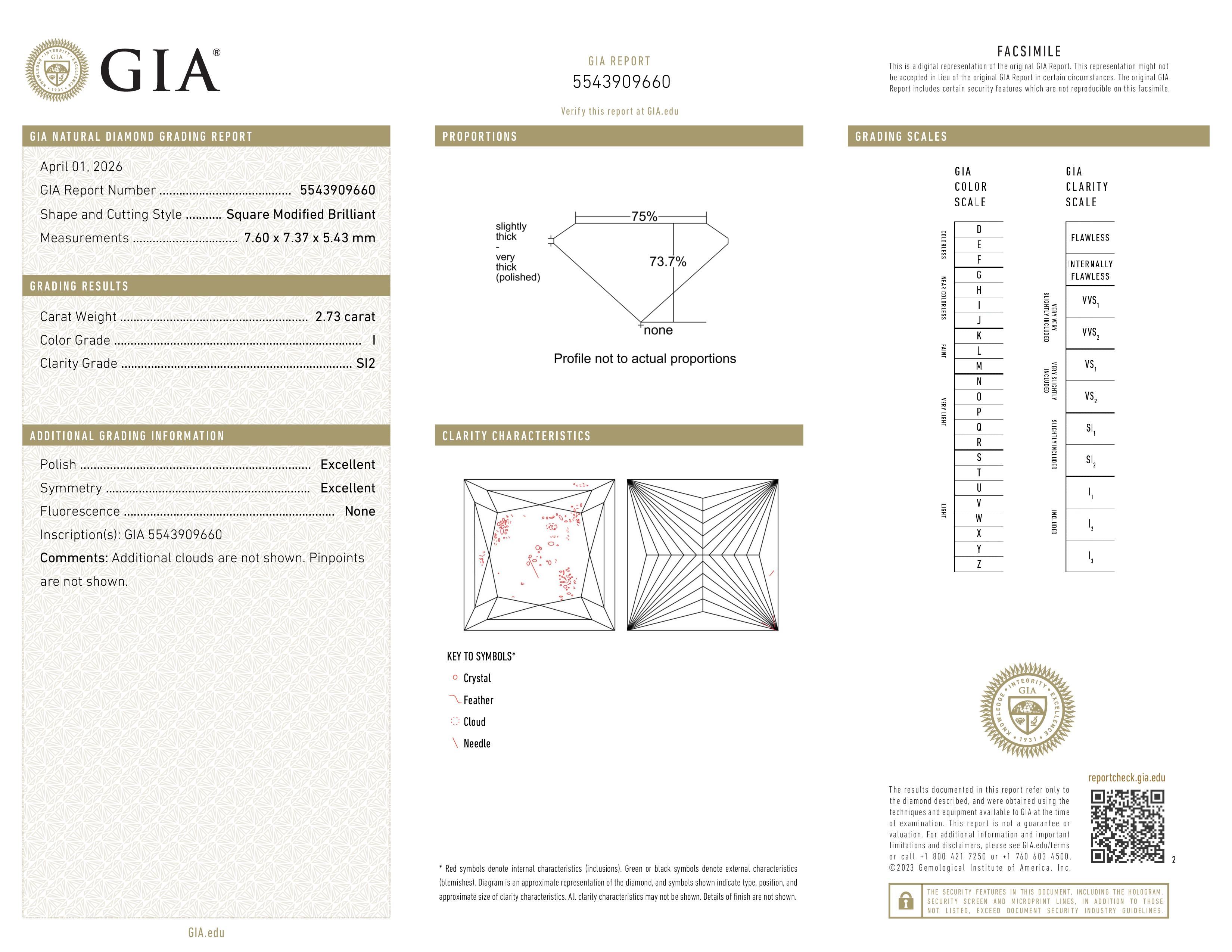 The GIA certificate (#5543909660) is an independent grading report that verifies this diamond's carat weight, color, clarity, cut, and other physical properties. It serves as a trusted third-party guarantee of the stone's quality. Always verify the certificate number on the issuing lab's website before purchasing.