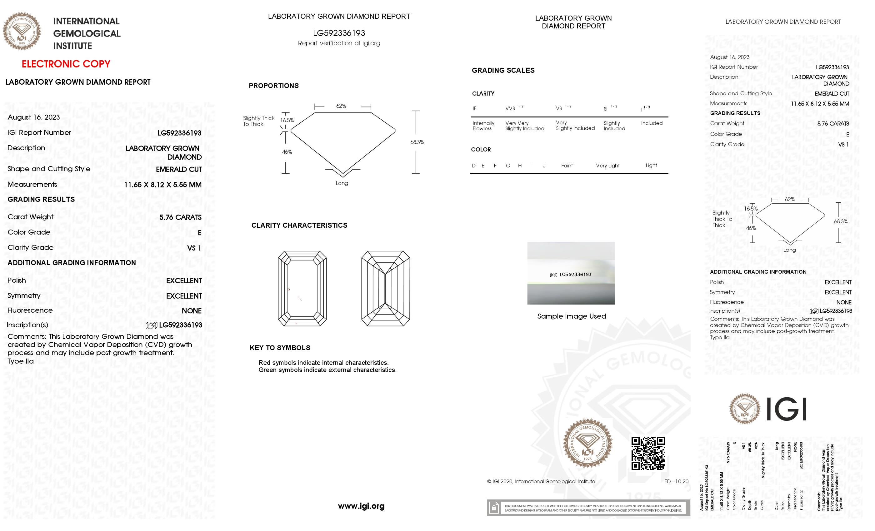 This 5.76 carat emerald cut lab grown diamond (IGI #592336193) is currently listed at 5 retailers. Prices across stores range from $1,263 to $8,776, a spread of $7,513 (595%). The same certified stone can vary in price depending on a retailer's margin, promotions, and included services comparing offers side by side is the fastest way to find the best deal.