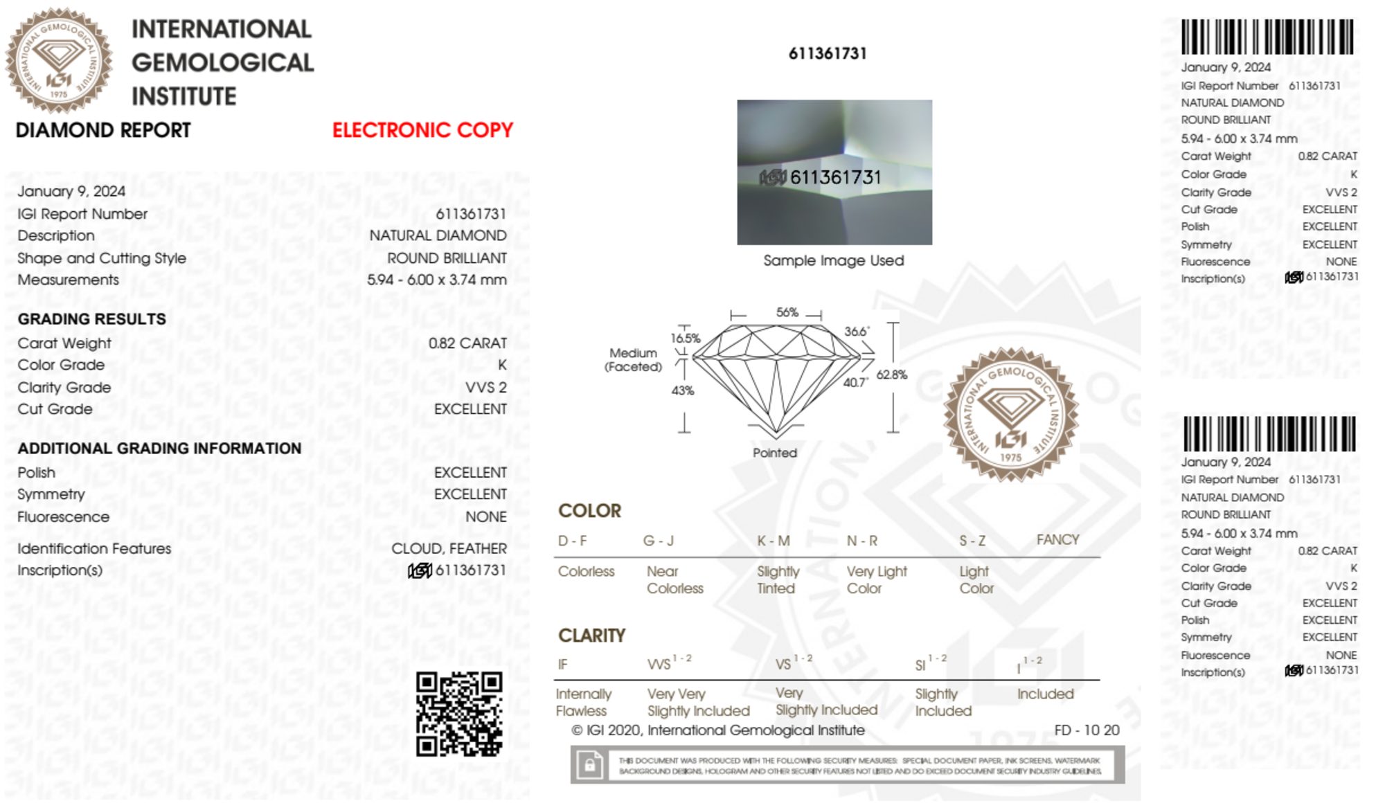 The IGI certificate (#611361731) is an independent grading report that verifies this diamond's carat weight, color, clarity, cut, and other physical properties. It serves as a trusted third-party guarantee of the stone's quality. Always verify the certificate number on the issuing lab's website before purchasing.