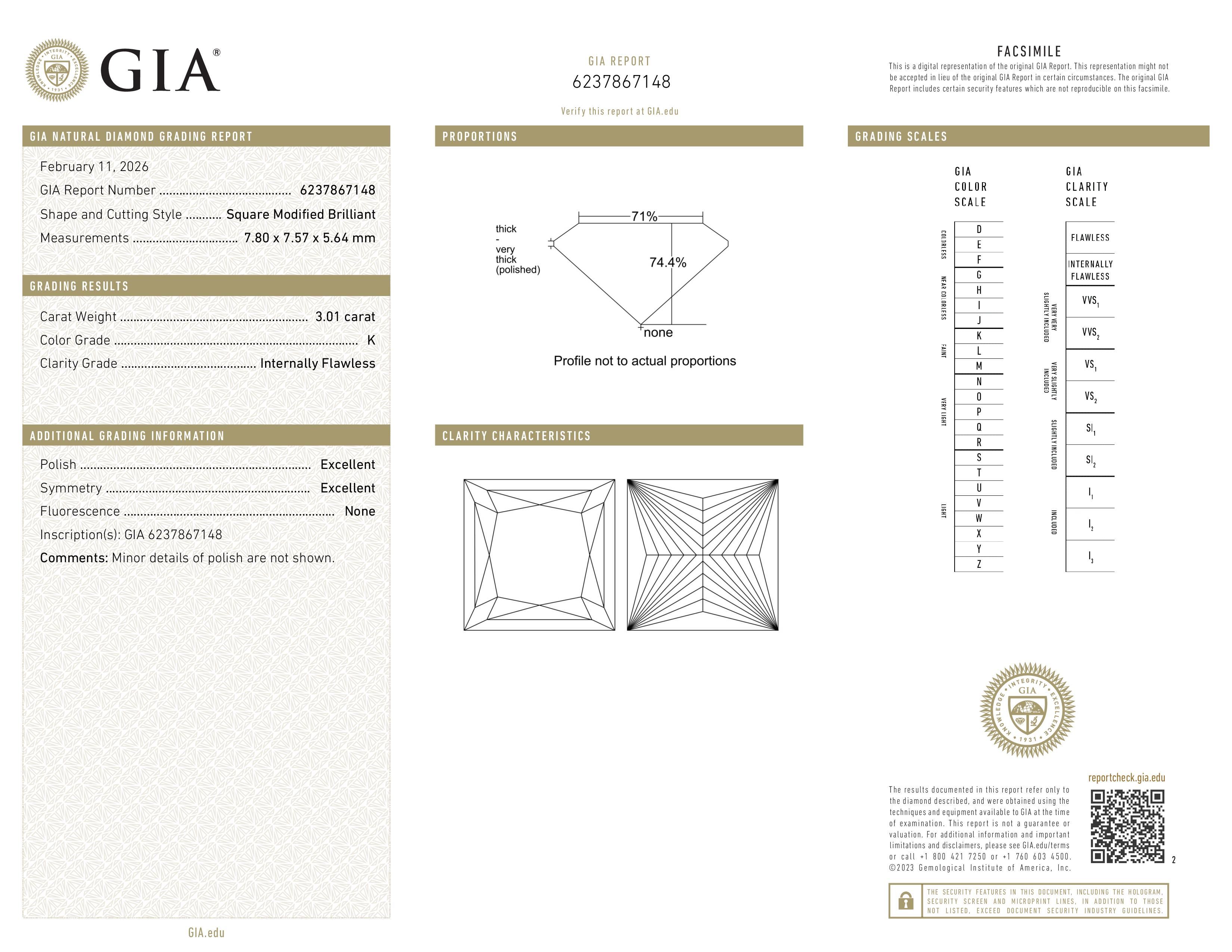 The GIA certificate (#6237867148) is an independent grading report that verifies this diamond's carat weight, color, clarity, cut, and other physical properties. It serves as a trusted third-party guarantee of the stone's quality. Always verify the certificate number on the issuing lab's website before purchasing.