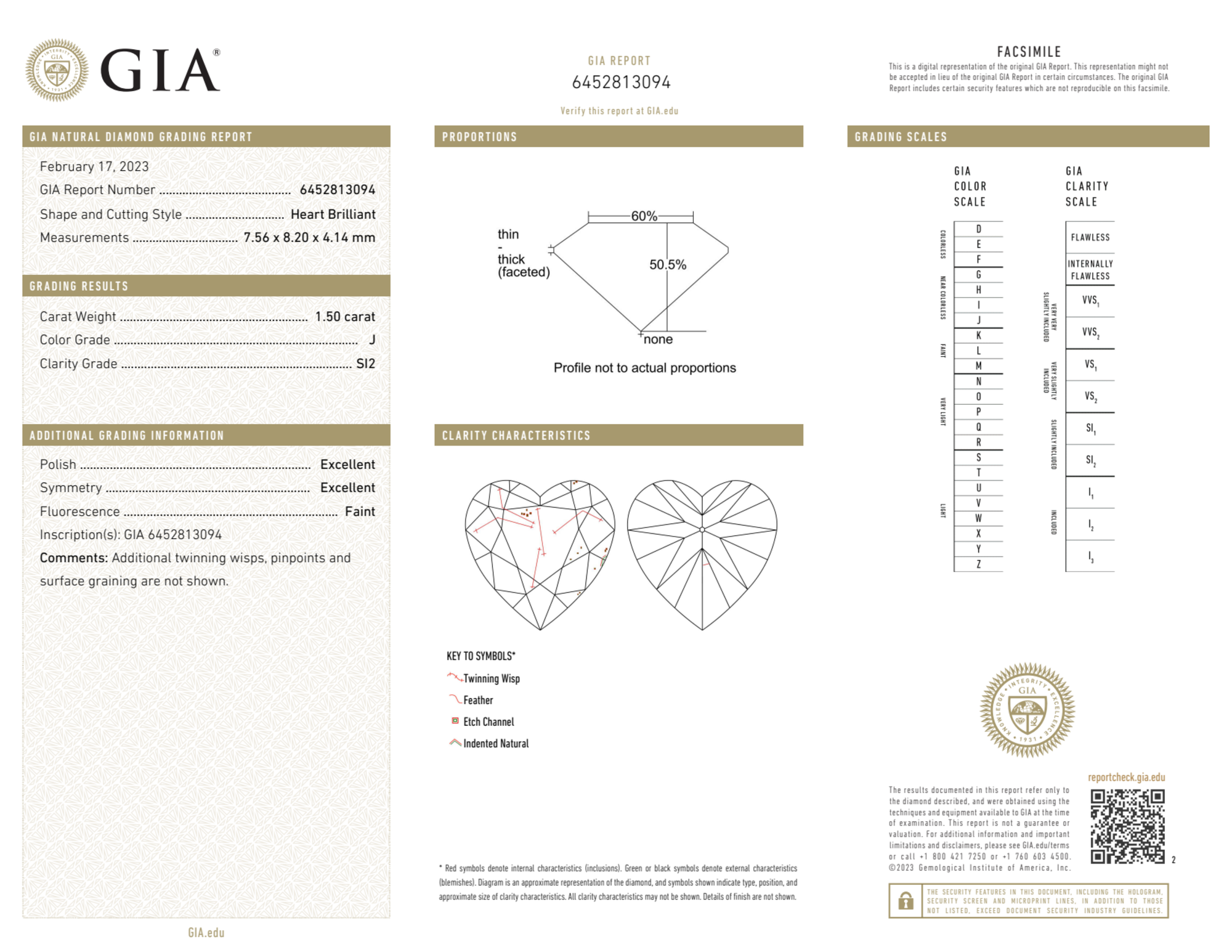 The GIA certificate (#6452813094) is an independent grading report that verifies this diamond's carat weight, color, clarity, cut, and other physical properties. It serves as a trusted third-party guarantee of the stone's quality. Always verify the certificate number on the issuing lab's website before purchasing.