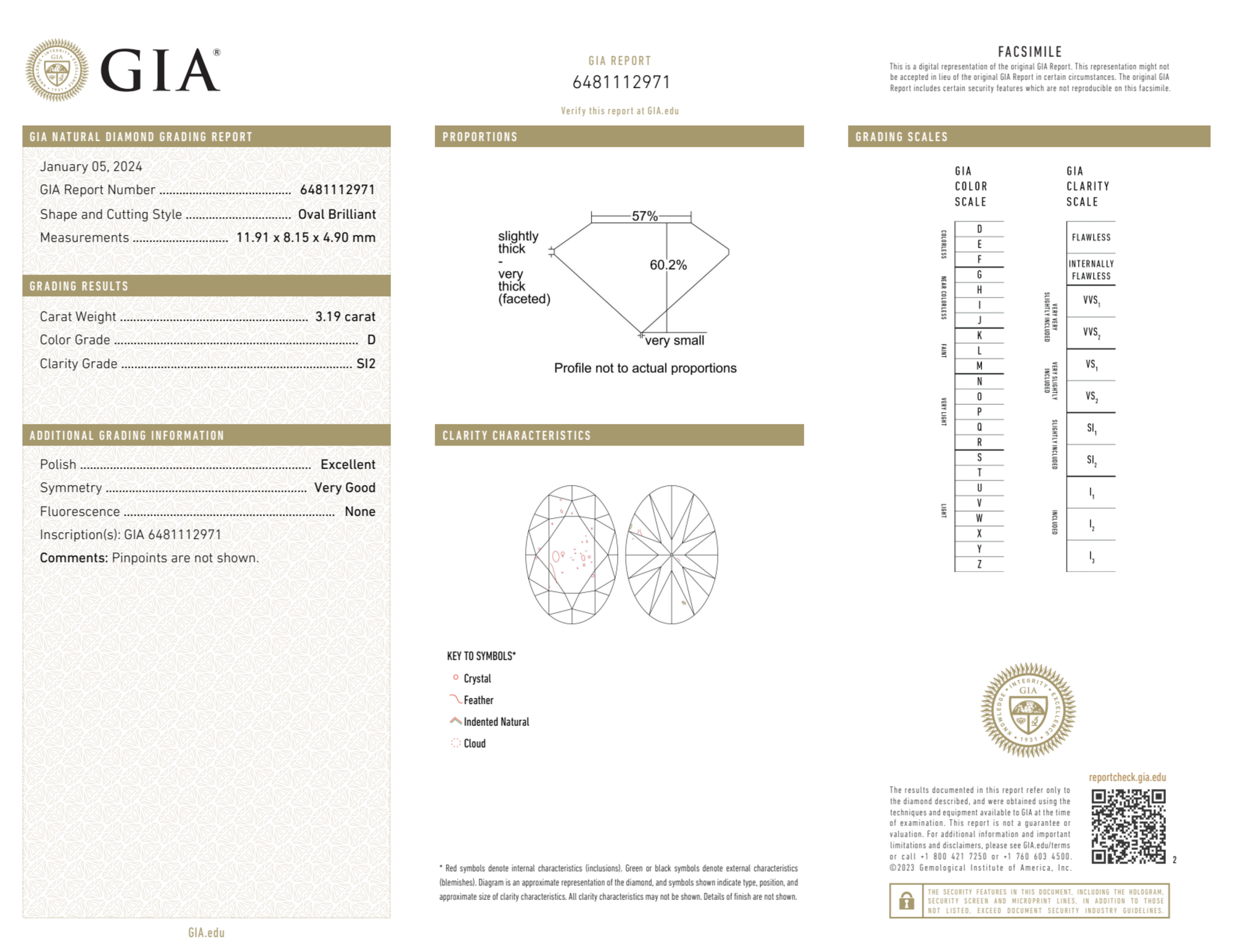 The GIA certificate (#6481112971) is an independent grading report that verifies this diamond's carat weight, color, clarity, cut, and other physical properties. It serves as a trusted third-party guarantee of the stone's quality. Always verify the certificate number on the issuing lab's website before purchasing.