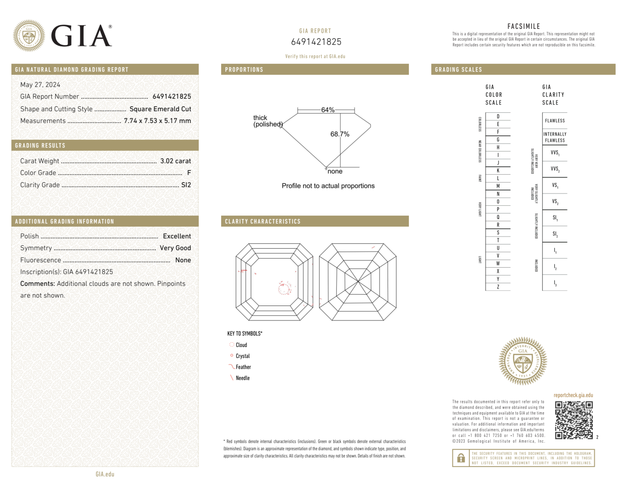 The GIA certificate (#6491421825) is an independent grading report that verifies this diamond's carat weight, color, clarity, cut, and other physical properties. It serves as a trusted third-party guarantee of the stone's quality. Always verify the certificate number on the issuing lab's website before purchasing.