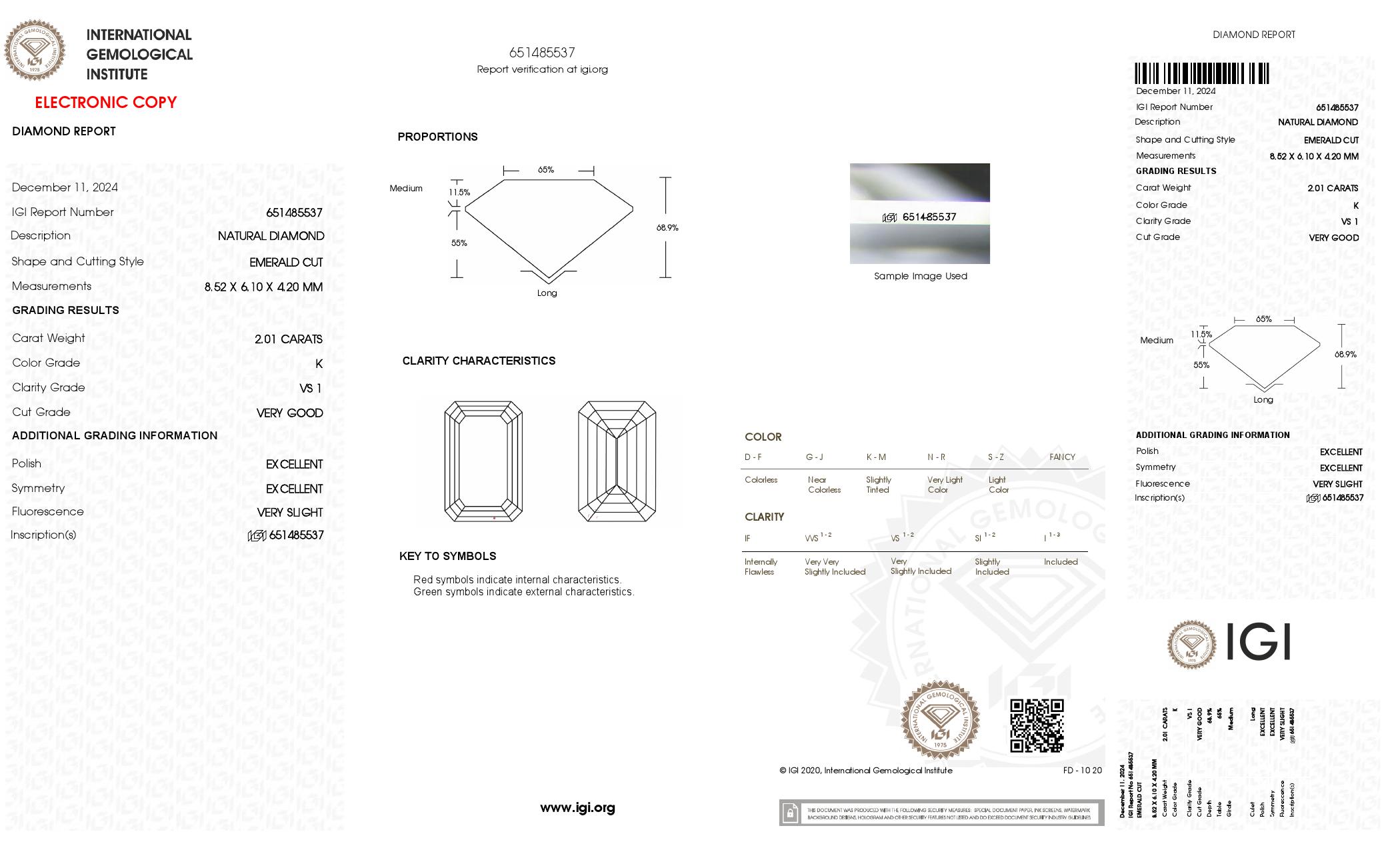 The IGI certificate (#651485537) is an independent grading report that verifies this diamond's carat weight, color, clarity, cut, and other physical properties. It serves as a trusted third-party guarantee of the stone's quality. Always verify the certificate number on the issuing lab's website before purchasing.