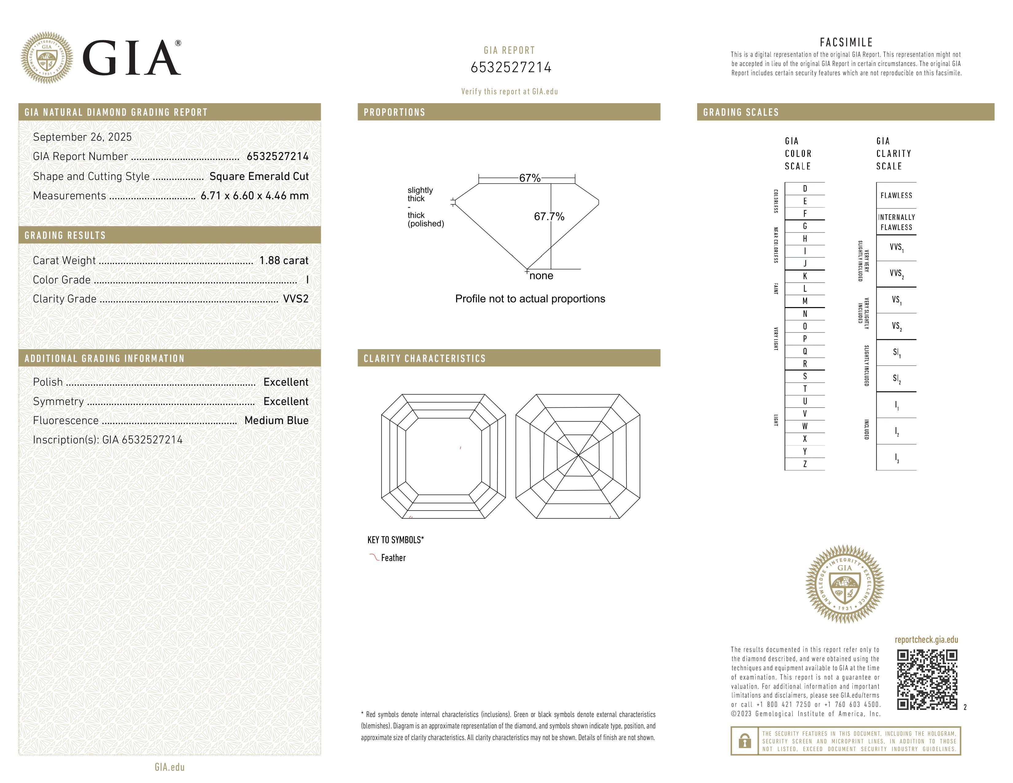 The GIA certificate (#6532527214) is an independent grading report that verifies this diamond's carat weight, color, clarity, cut, and other physical properties. It serves as a trusted third-party guarantee of the stone's quality. Always verify the certificate number on the issuing lab's website before purchasing.