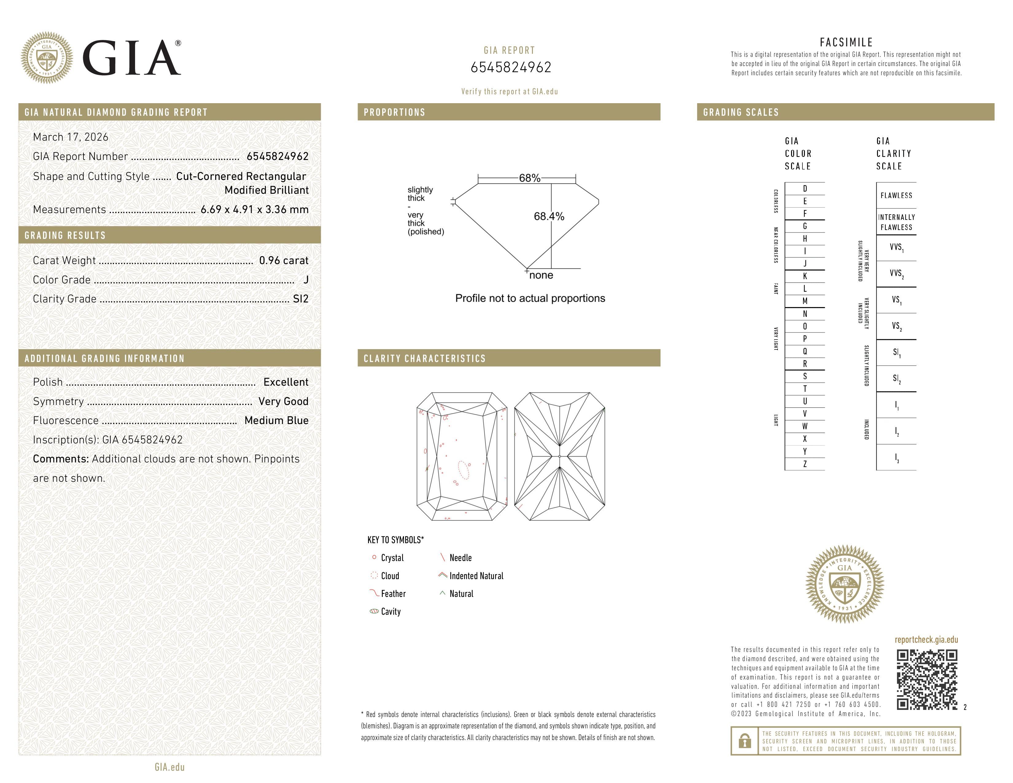 The GIA certificate (#6545824962) is an independent grading report that verifies this diamond's carat weight, color, clarity, cut, and other physical properties. It serves as a trusted third-party guarantee of the stone's quality. Always verify the certificate number on the issuing lab's website before purchasing.