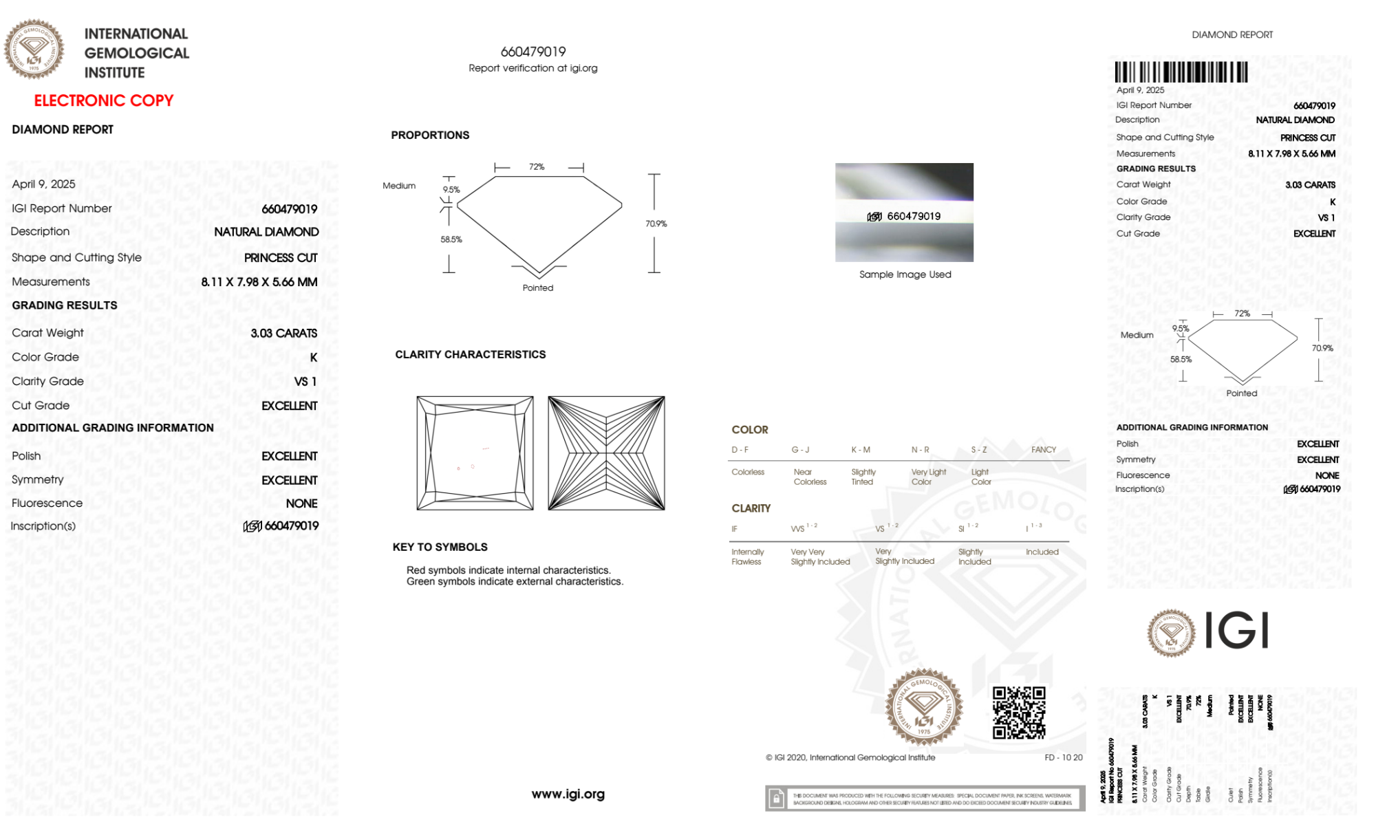 The IGI certificate (#660479019) is an independent grading report that verifies this diamond's carat weight, color, clarity, cut, and other physical properties. It serves as a trusted third-party guarantee of the stone's quality. Always verify the certificate number on the issuing lab's website before purchasing.