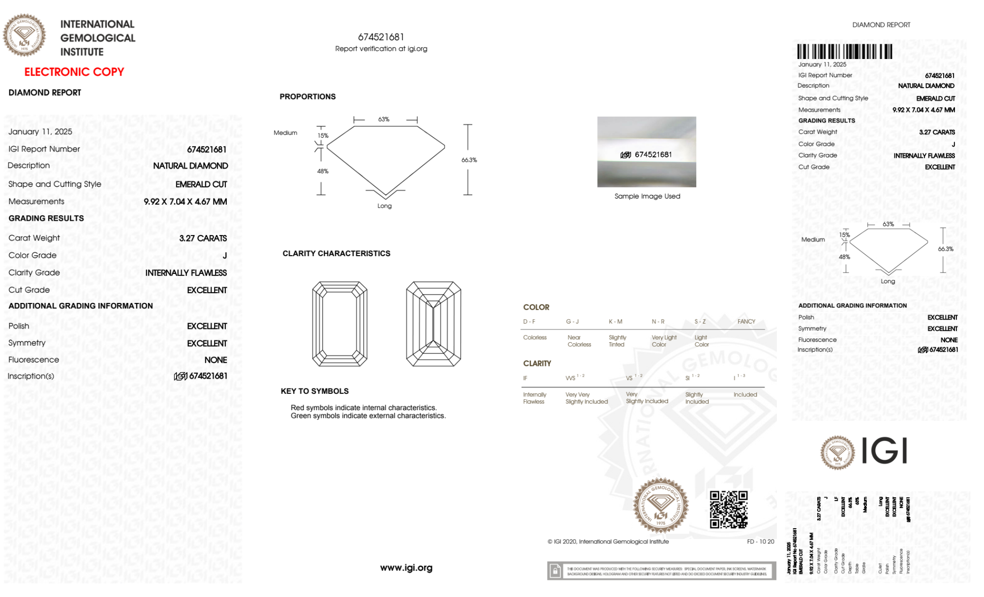 The IGI certificate (#674521681) is an independent grading report that verifies this diamond's carat weight, color, clarity, cut, and other physical properties. It serves as a trusted third-party guarantee of the stone's quality. Always verify the certificate number on the issuing lab's website before purchasing.