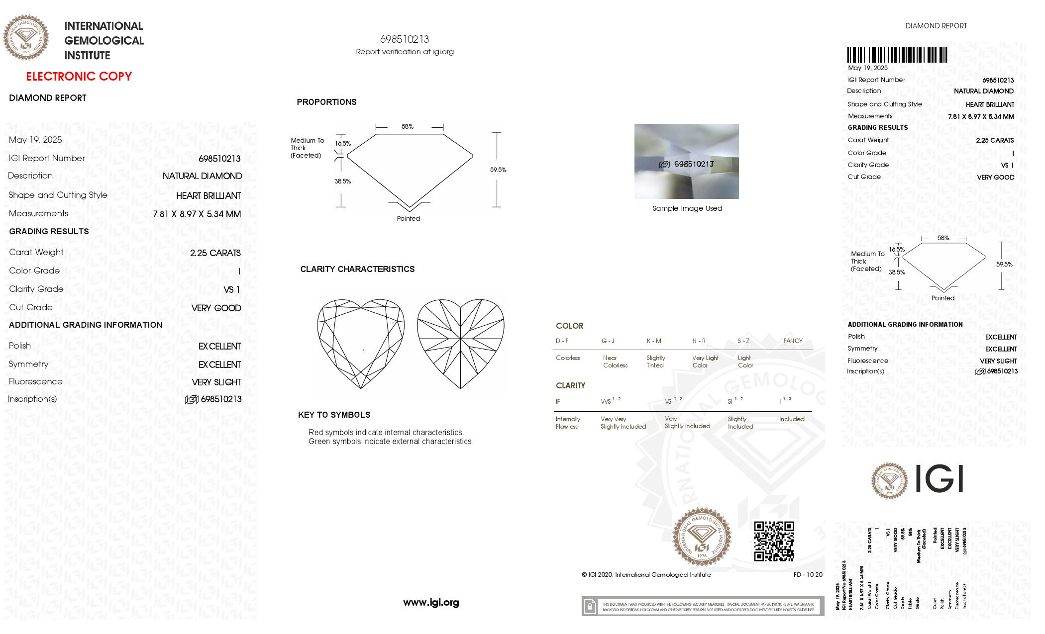 The IGI certificate (#698510213) is an independent grading report that verifies this diamond's carat weight, color, clarity, cut, and other physical properties. It serves as a trusted third-party guarantee of the stone's quality. Always verify the certificate number on the issuing lab's website before purchasing.