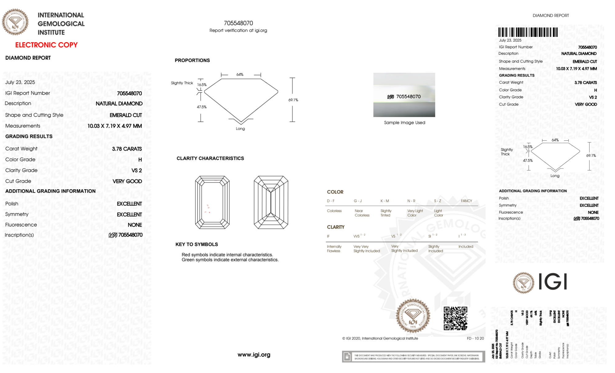 The IGI certificate (#705548070) is an independent grading report that verifies this diamond's carat weight, color, clarity, cut, and other physical properties. It serves as a trusted third-party guarantee of the stone's quality. Always verify the certificate number on the issuing lab's website before purchasing.