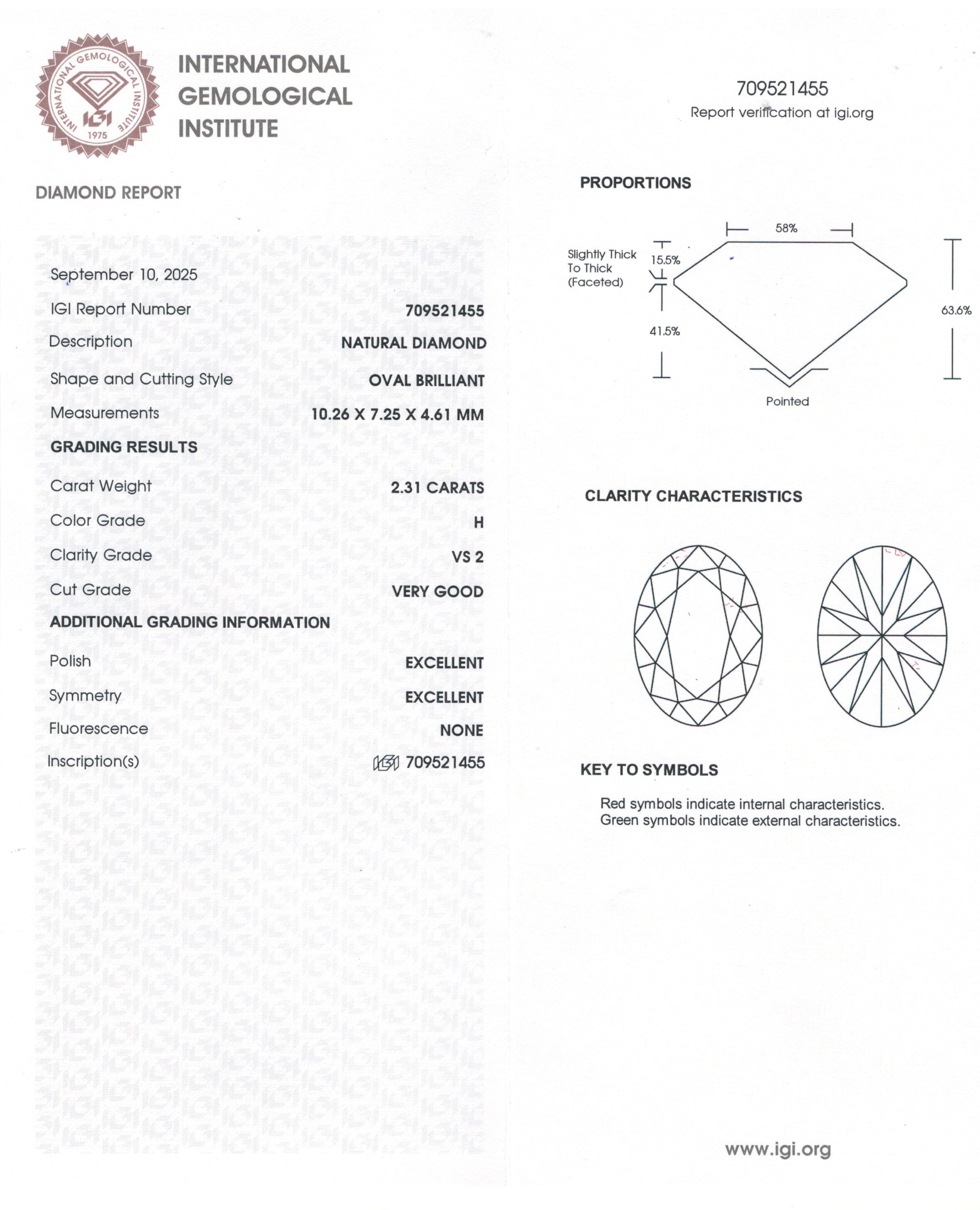 The IGI certificate (#709521455) is an independent grading report that verifies this diamond's carat weight, color, clarity, cut, and other physical properties. It serves as a trusted third-party guarantee of the stone's quality. Always verify the certificate number on the issuing lab's website before purchasing.
