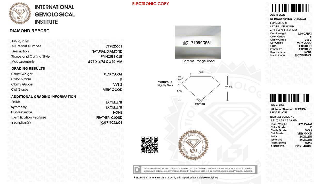 The IGI certificate (#719523651) is an independent grading report that verifies this diamond's carat weight, color, clarity, cut, and other physical properties. It serves as a trusted third-party guarantee of the stone's quality. Always verify the certificate number on the issuing lab's website before purchasing.