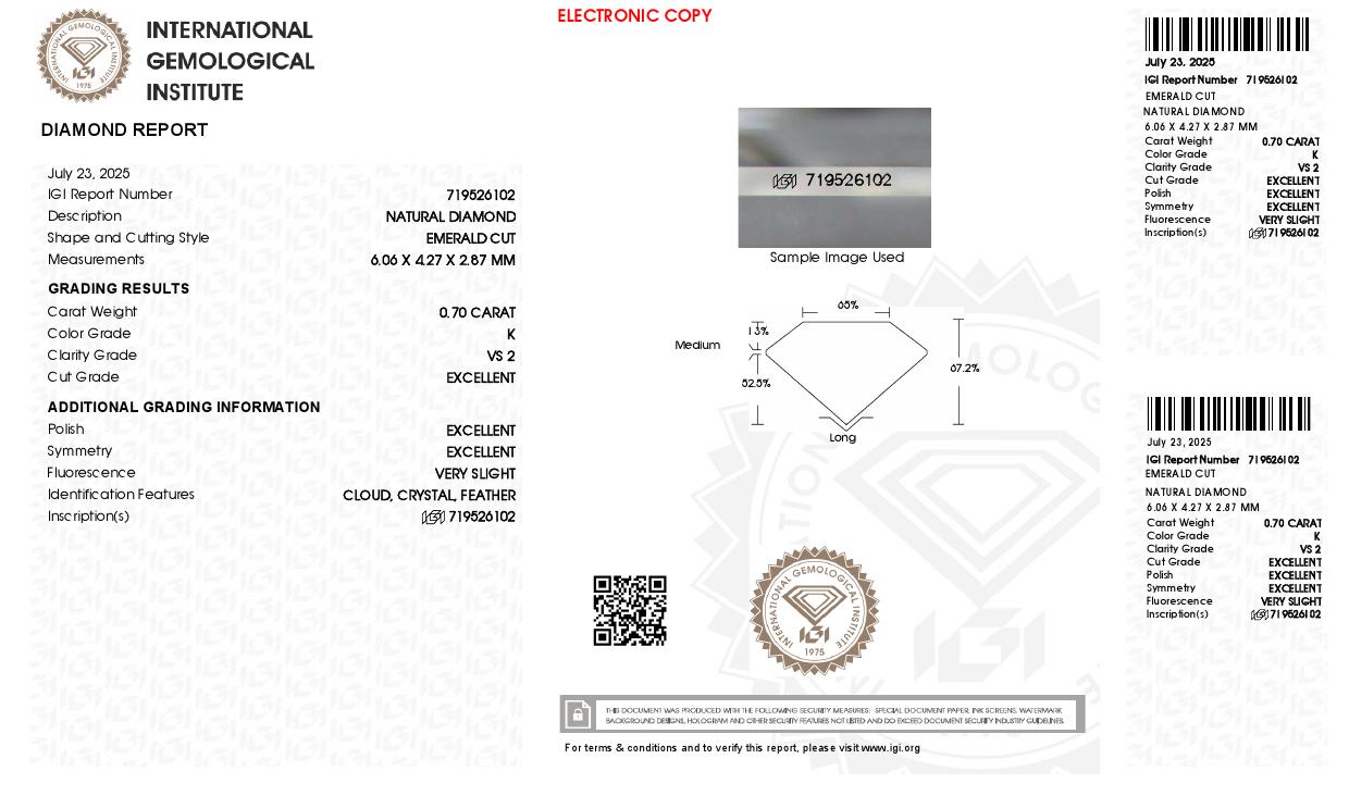 The IGI certificate (#719526102) is an independent grading report that verifies this diamond's carat weight, color, clarity, cut, and other physical properties. It serves as a trusted third-party guarantee of the stone's quality. Always verify the certificate number on the issuing lab's website before purchasing.