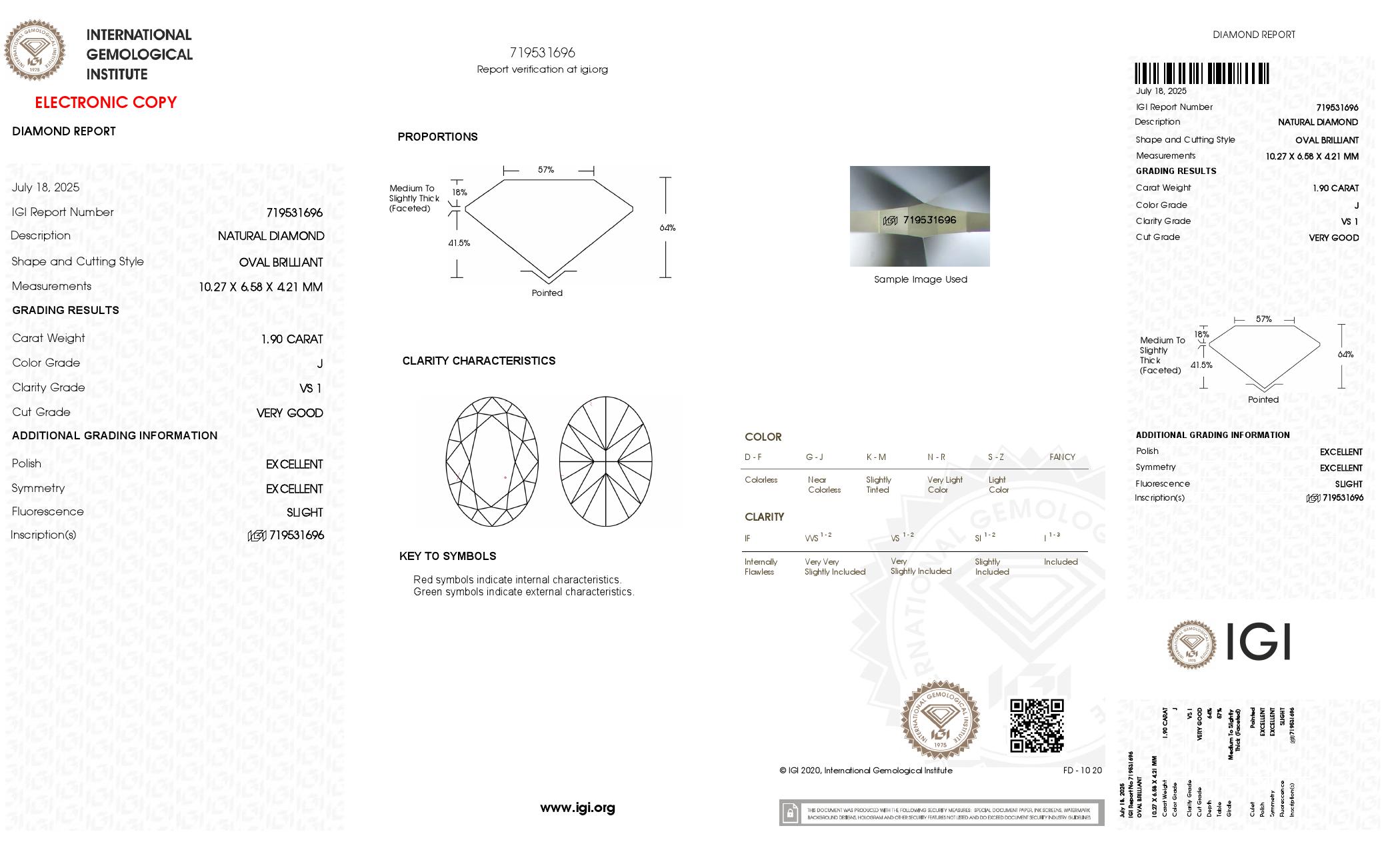 The IGI certificate (#719531696) is an independent grading report that verifies this diamond's carat weight, color, clarity, cut, and other physical properties. It serves as a trusted third-party guarantee of the stone's quality. Always verify the certificate number on the issuing lab's website before purchasing.
