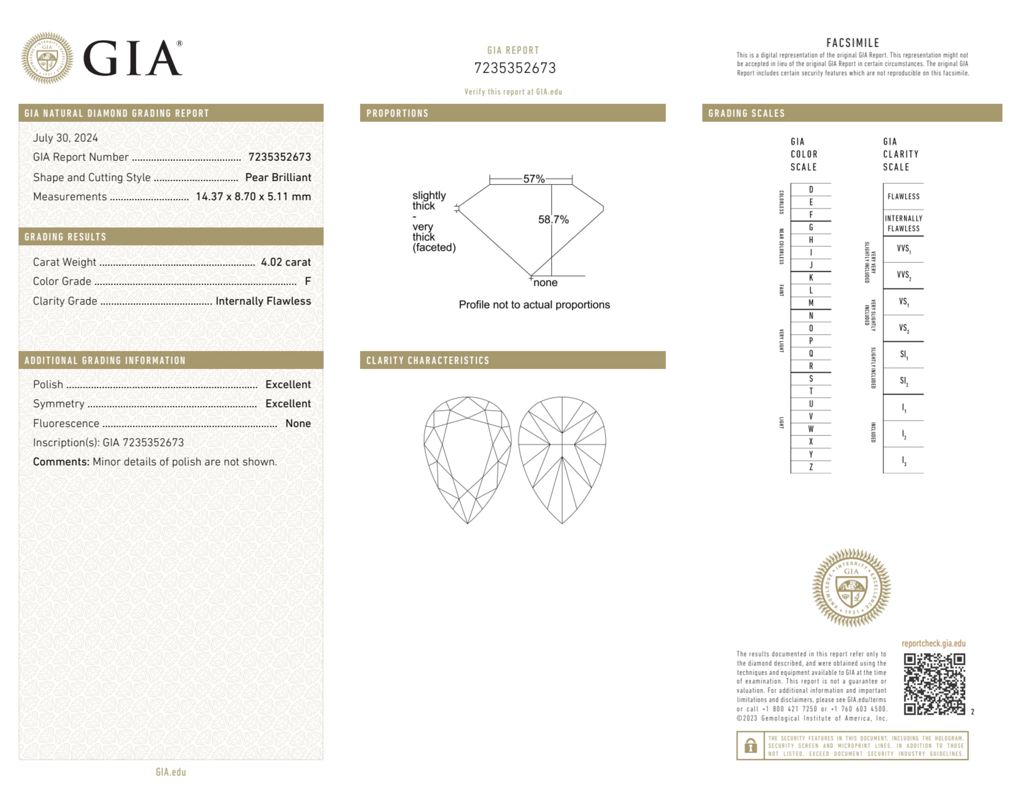 The GIA certificate (#7235352673) is an independent grading report that verifies this diamond's carat weight, color, clarity, cut, and other physical properties. It serves as a trusted third-party guarantee of the stone's quality. Always verify the certificate number on the issuing lab's website before purchasing.