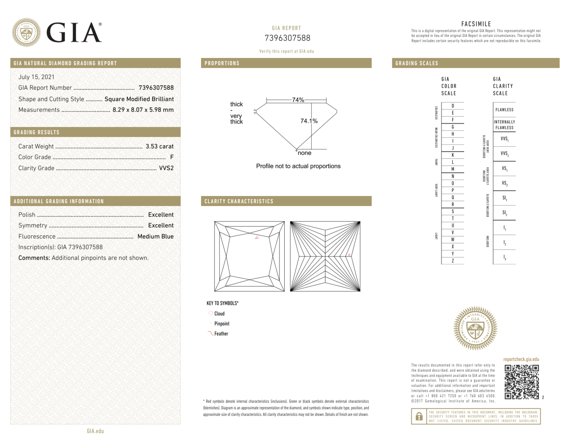 The GIA certificate (#7396307588) is an independent grading report that verifies this diamond's carat weight, color, clarity, cut, and other physical properties. It serves as a trusted third-party guarantee of the stone's quality. Always verify the certificate number on the issuing lab's website before purchasing.