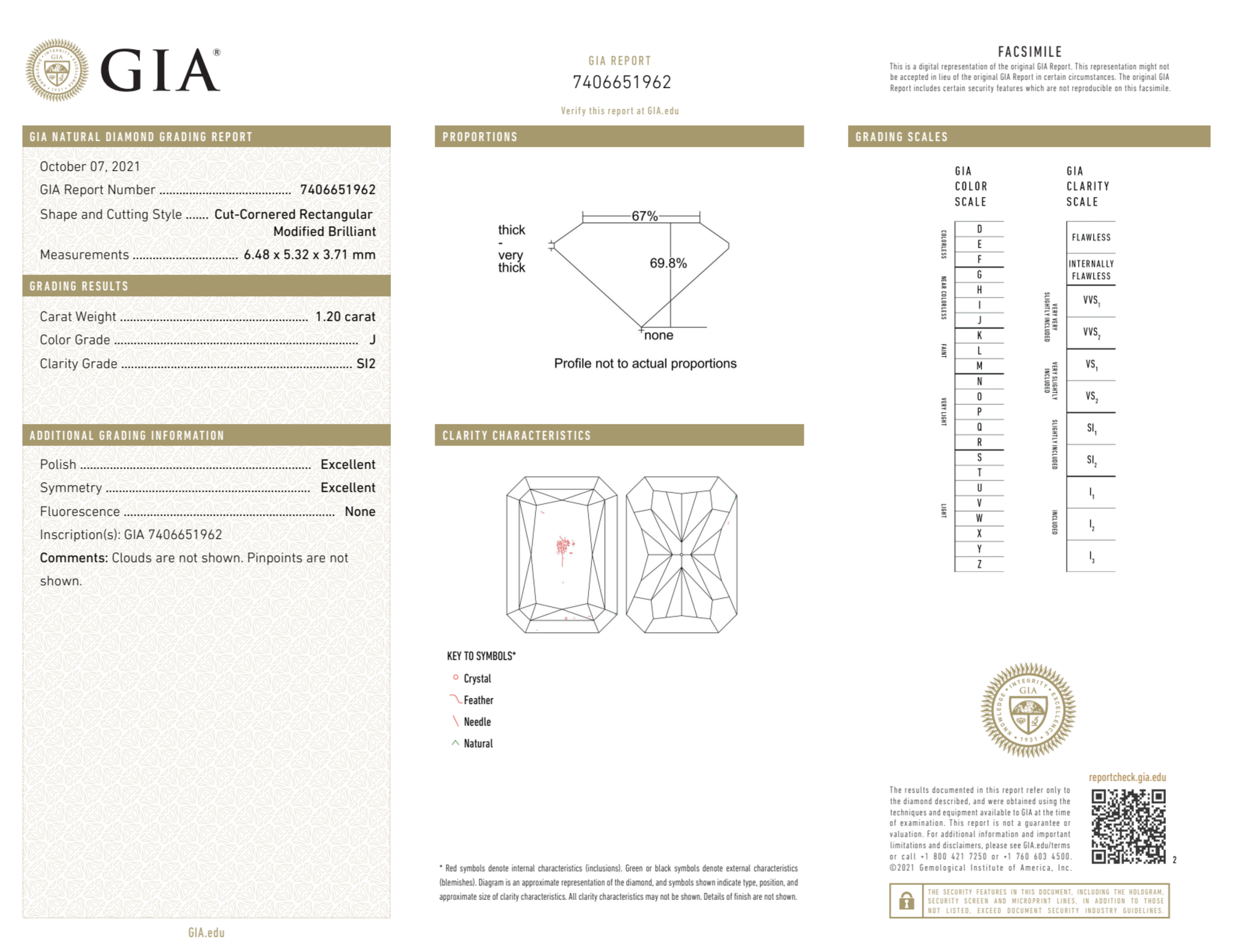 The GIA certificate (#7406651962) is an independent grading report that verifies this diamond's carat weight, color, clarity, cut, and other physical properties. It serves as a trusted third-party guarantee of the stone's quality. Always verify the certificate number on the issuing lab's website before purchasing.