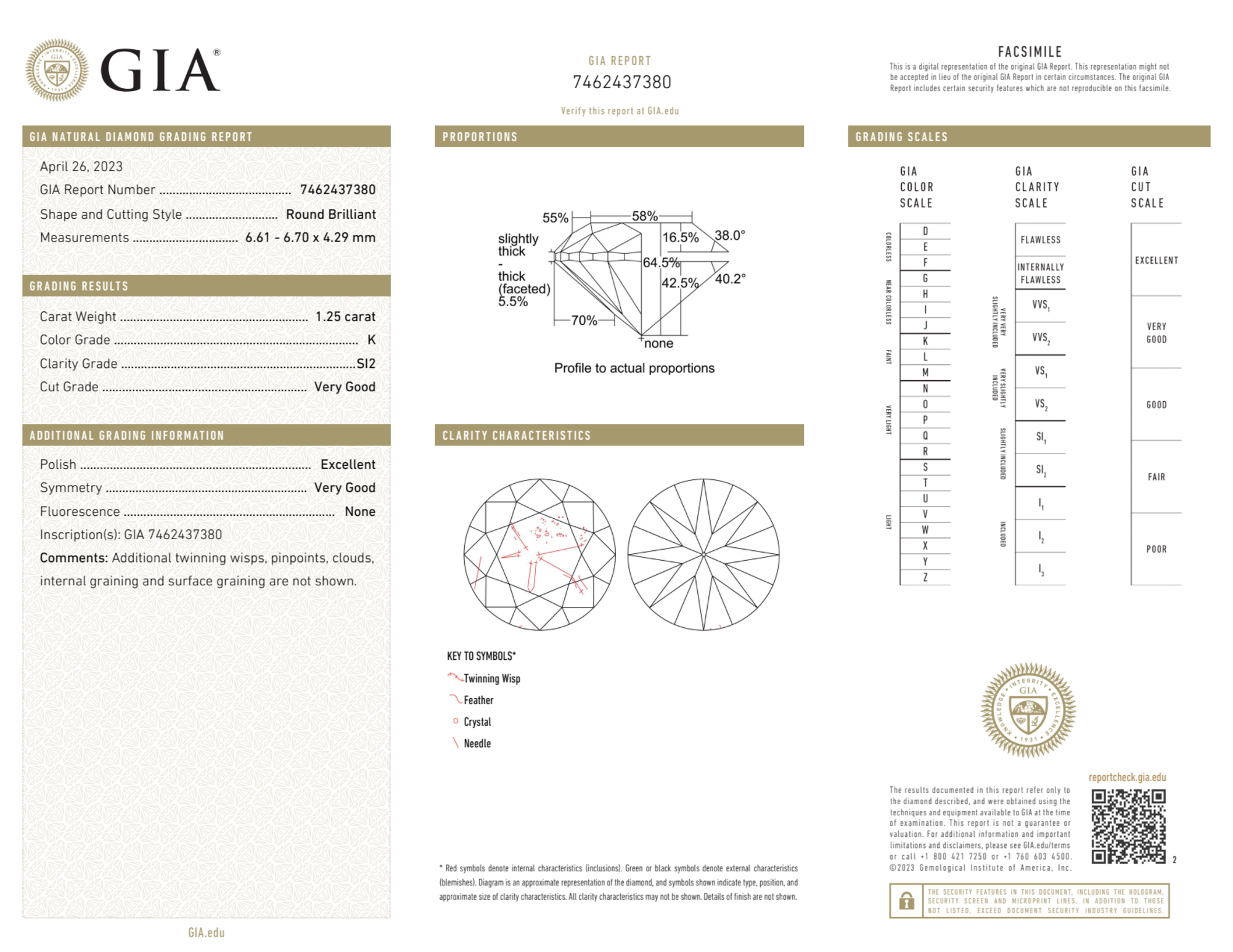 The GIA certificate (#7462437380) is an independent grading report that verifies this diamond's carat weight, color, clarity, cut, and other physical properties. It serves as a trusted third-party guarantee of the stone's quality. Always verify the certificate number on the issuing lab's website before purchasing.