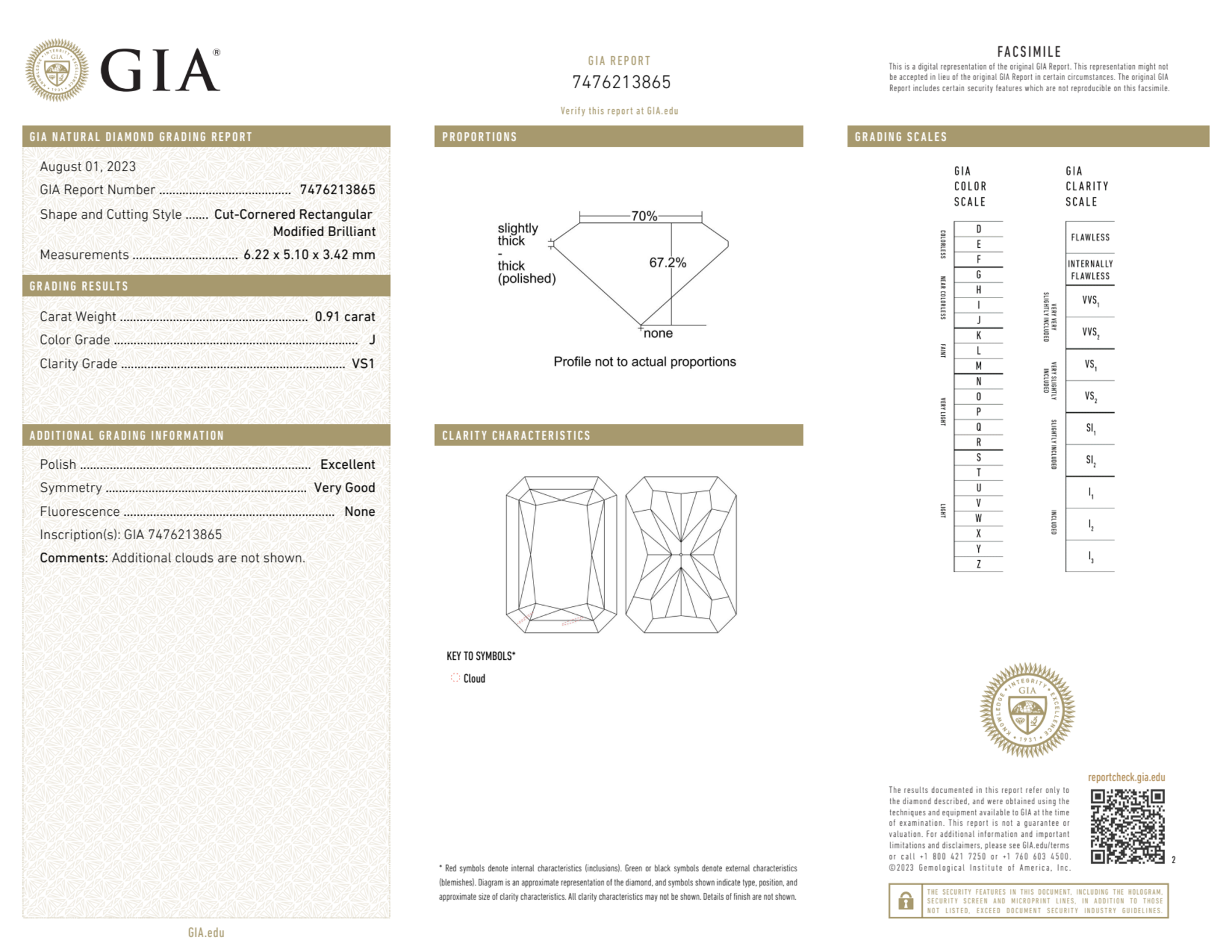 The GIA certificate (#7476213865) is an independent grading report that verifies this diamond's carat weight, color, clarity, cut, and other physical properties. It serves as a trusted third-party guarantee of the stone's quality. Always verify the certificate number on the issuing lab's website before purchasing.