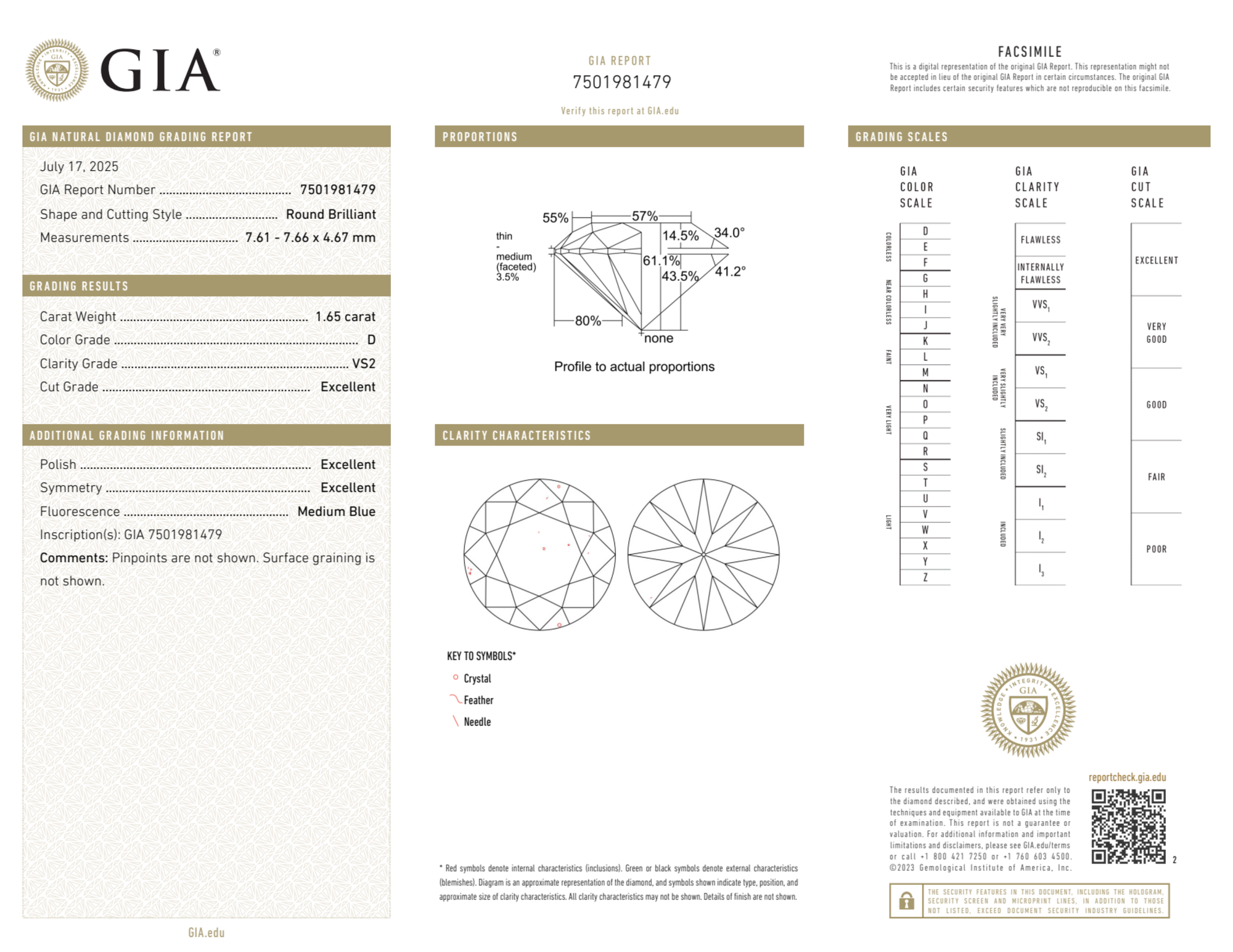 The GIA certificate (#7501981479) is an independent grading report that verifies this diamond's carat weight, color, clarity, cut, and other physical properties. It serves as a trusted third-party guarantee of the stone's quality. Always verify the certificate number on the issuing lab's website before purchasing.