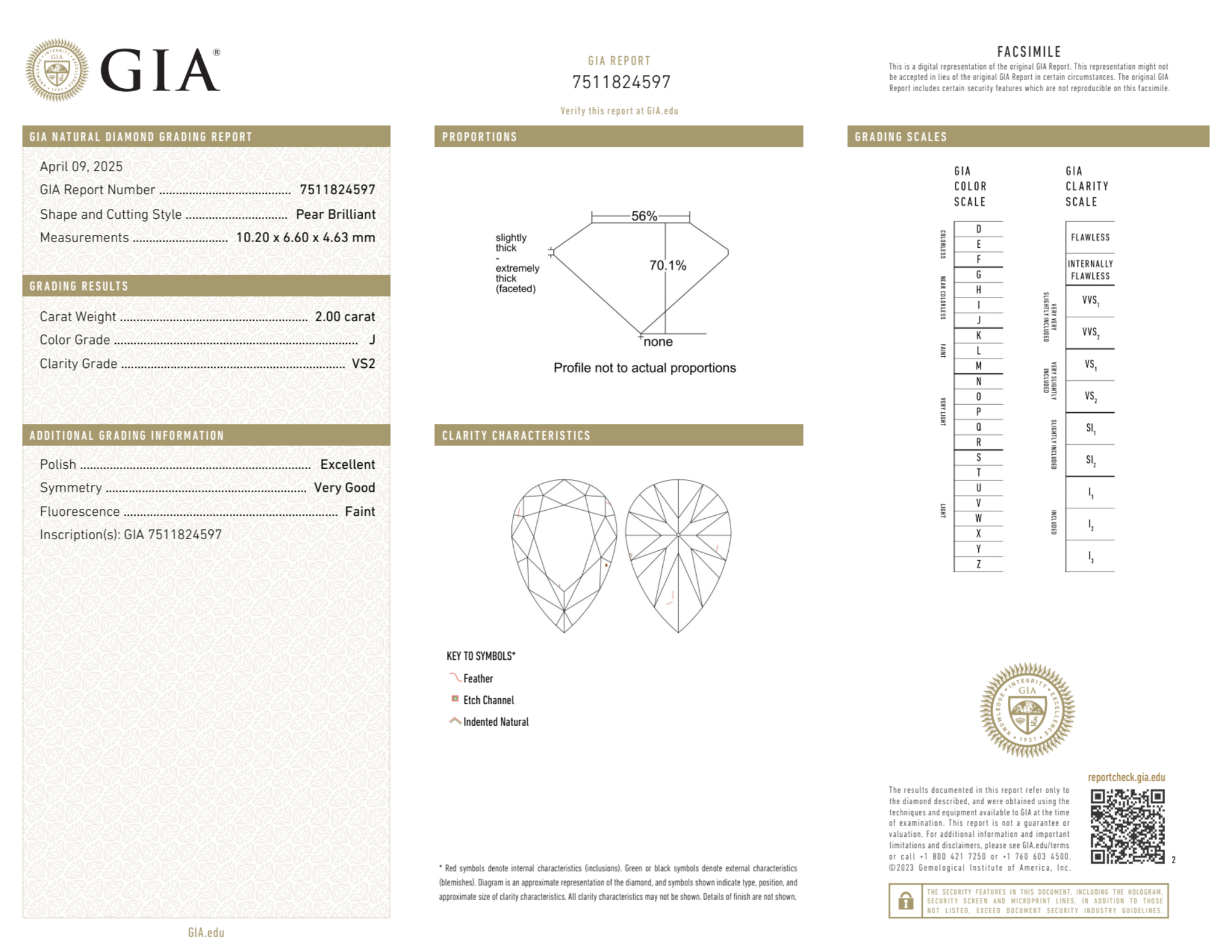 The GIA certificate (#7511824597) is an independent grading report that verifies this diamond's carat weight, color, clarity, cut, and other physical properties. It serves as a trusted third-party guarantee of the stone's quality. Always verify the certificate number on the issuing lab's website before purchasing.