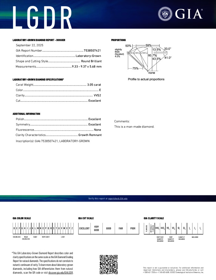 The GIA certificate (#7538507421) is an independent grading report that verifies this diamond's carat weight, color, clarity, cut, and other physical properties. It serves as a trusted third-party guarantee of the stone's quality. Always verify the certificate number on the issuing lab's website before purchasing.