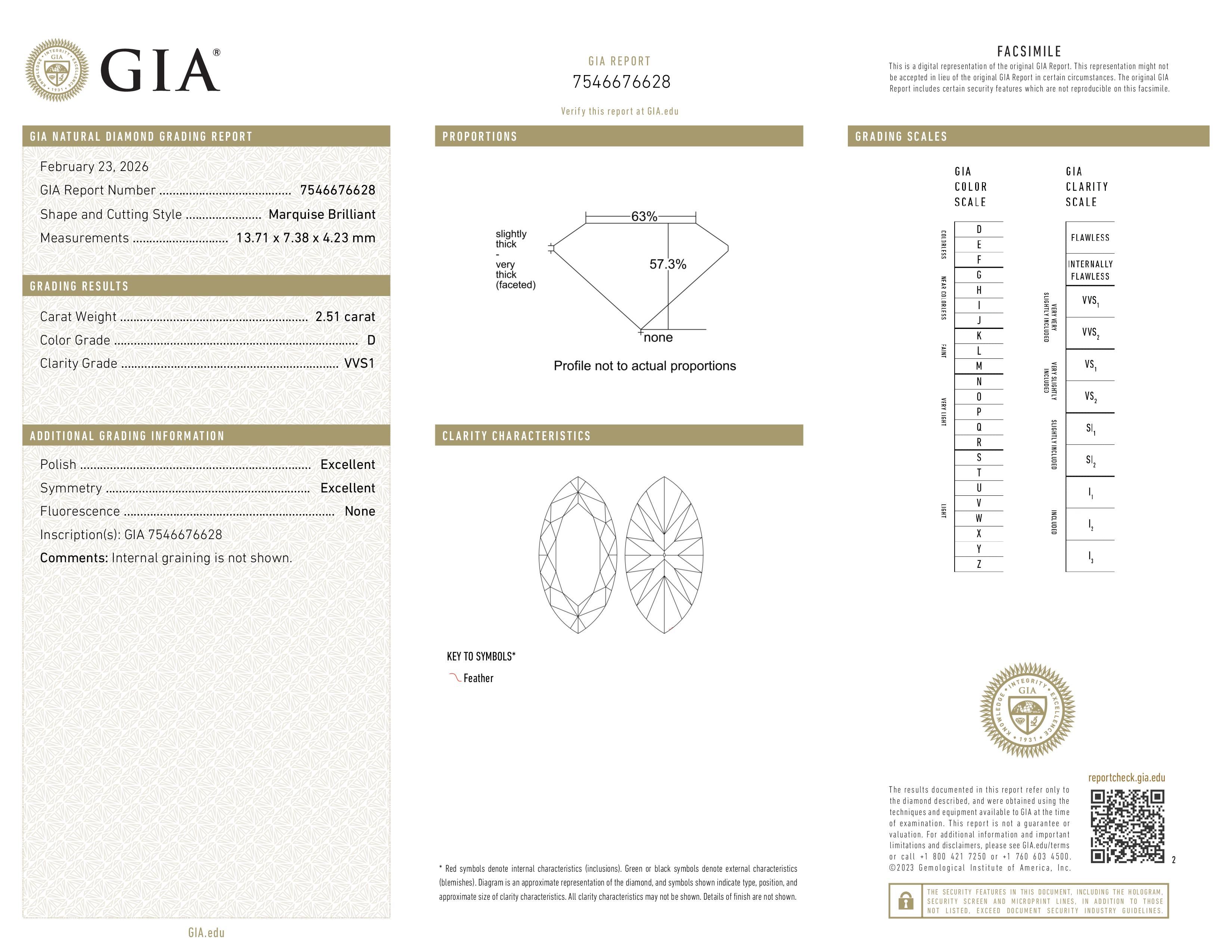 The GIA certificate (#7546676628) is an independent grading report that verifies this diamond's carat weight, color, clarity, cut, and other physical properties. It serves as a trusted third-party guarantee of the stone's quality. Always verify the certificate number on the issuing lab's website before purchasing.