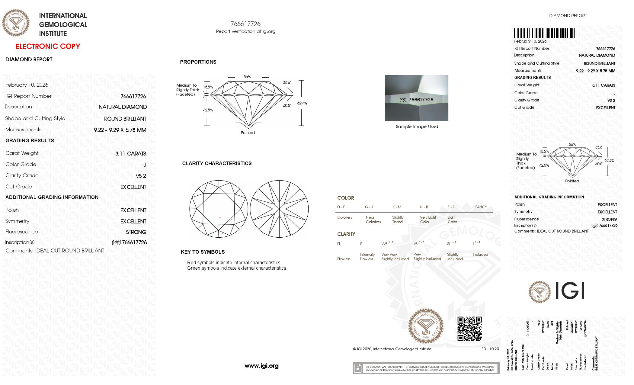 The IGI certificate (#766617726) is an independent grading report that verifies this diamond's carat weight, color, clarity, cut, and other physical properties. It serves as a trusted third-party guarantee of the stone's quality. Always verify the certificate number on the issuing lab's website before purchasing.
